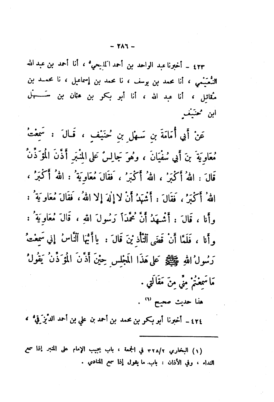 423 - أَخْبَرَنَا عَبْدُ الْوَاحِدِ بْنُ أَحْمَدَ الْمَلِيحِيُّ، أَنَا أَحْمَدُ بْنُ عَبْدِ اللَّهِ النُّعَيْمِيُّ، أَنَا مُحَمَّدُ بْنُ يُوسُفَ، نَا مُحَمَّدُ بْنُ إِسْمَاعِيلَ، نَا مُحَمَّدُ بْنُ مُقَاتِلٍ، أَنَا عَبْدُ اللَّهِ، أَنَا أَبُو بَكْرِ بْنُ عُثْمَانَ بْنِ سَهْلِ بْنِ حُنَيْفٍ، عَنْ أَبِي أُمَامَةَ بْنِ سَهْلِ بْنِ حُنَيْفٍ، قَالَ: سَمِعْتُ مُعَاوِيَةَ بْنَ أَبِي سُفْيَانَ، وَهُوَ جَالِسٌ عَلَى الْمِنْبَرِ أَذَّنَ الْمُؤَذِّنُ قَالَ: " اللَّهُ أَكْبَرُ، اللَّهُ أَكْبَرُ، فَقَالَ مُعَاوِيَةُ: اللَّهُ أَكْبَرُ، اللَّهُ أَكْبَرُ، فَقَالَ: أَشْهَدُ أَنْ لَا إِلَهَ إِلا اللَّهُ، فَقَالَ مُعَاوِيَةُ: وَأَنَا، قَالَ: أَشْهَدُ أَنَّ مُحَمَّدًا رَسُولُ اللَّهِ، قَالَ مُعَاوِيَةُ: وَأَنَا، فَلَمَّا أَنْ قَضَى التَّأْذِينَ، قَالَ: يَا أَيُّهَا النَّاسُ، إِنِّي سَمِعْتُ رَسُولَ اللَّهِ صَلَّى اللهُ عَلَيْهِ وَسَلَّمَ عَلَى هَذَا الْمَجْلِسِ حِينَ أَذَّنَ الْمُؤَذِّنُ يَقُولُ مَا سَمِعْتُمْ مِنِّي مِنْ مَقَالَتِي ".