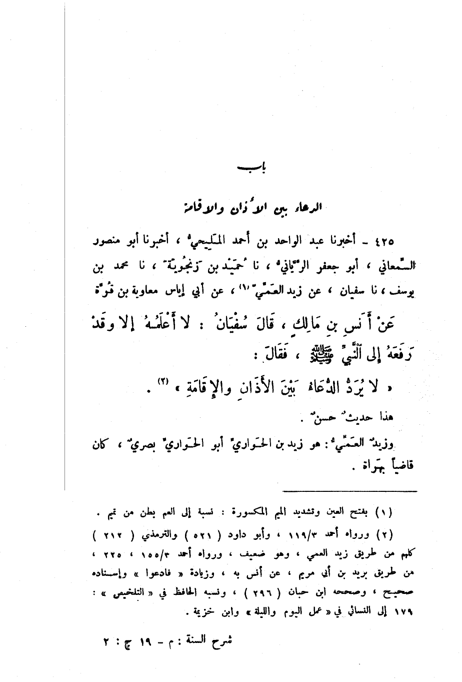 425 - أَخْبَرَنَا عَبْدُ الْوَاحِدِ بْنُ أَحْمَدَ الْمَلِيحِيُّ، أَخْبَرَنَا أَبُو مَنْصُورٍ السَّمْعَانِيُّ، نَا أَبُو جَعْفَرٍ الرَّيَّانِيُّ، نَا حُمَيْدُ بْنُ زَنْجُوَيْهِ، نَا مُحَمَّدُ بْنُ يُوسُفَ، نَا سُفْيَانُ، عَنْ زَيْدٍ الْعَمِّيِّ، عَنْ أَبِي إِيَاسٍ مُعَاوِيَةَ بْنِ قُرَّةَ، عَنْ أَنَسِ بْنِ مَالِكٍ، قَالَ سُفْيَانُ: لَا أَعْلَمُهُ إِلا وَقَدْ رَفَعَهُ إِلَى النَّبِيِّ صَلَّى اللهُ عَلَيْهِ وَسَلَّمَ، فَقَالَ: «لَا يُرَدُّ الدُّعَاءُ بَيْنَ الأَذَانِ وَالإِقَامَةِ».