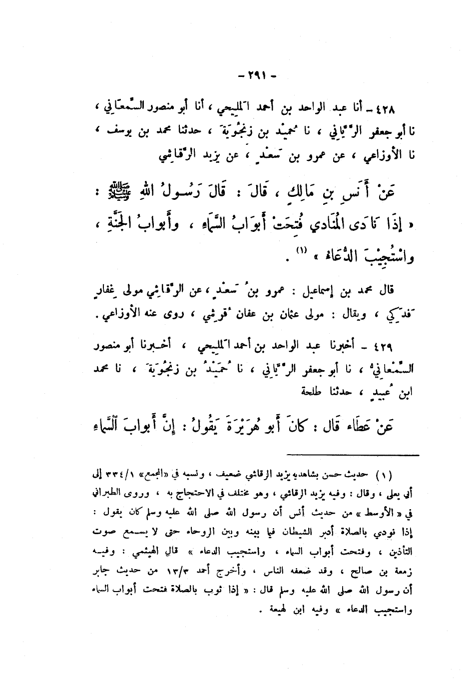 428 - أَنَا عَبْدُ الْوَاحِدِ بْنُ أَحْمَدَ الْمَلِيحِيُّ، أَنَا أَبُو مَنْصُورٍ السَّمْعَانِيُّ، نَا أَبُو جَعْفَرٍ الرَّيَّانِيُّ، نَا حُمَيْدُ بْنُ زَنْجُوَيْهِ، حَدَّثَنَا مُحَمَّدُ بْنُ يُوسُفَ، نَا الأَوْزَاعِيُّ، عَنْ عَمْرِو بْنِ سَعْدٍ، عَنْ يَزِيدَ الرَّقَاشِيِّ، عَنْ أَنَسِ بْنِ مَالِكٍ، قَالَ: قَالَ رَسُولُ اللَّهِ صَلَّى اللهُ عَلَيْهِ وَسَلَّمَ: «إِذَا نَادَى الْمُنَادِي فُتِحَتْ أَبْوَابُ السَّمَاءِ وَأَبْوَابُ الْجَنَّةِ، وَاسْتُجِيبَ الدُّعَاءُ».