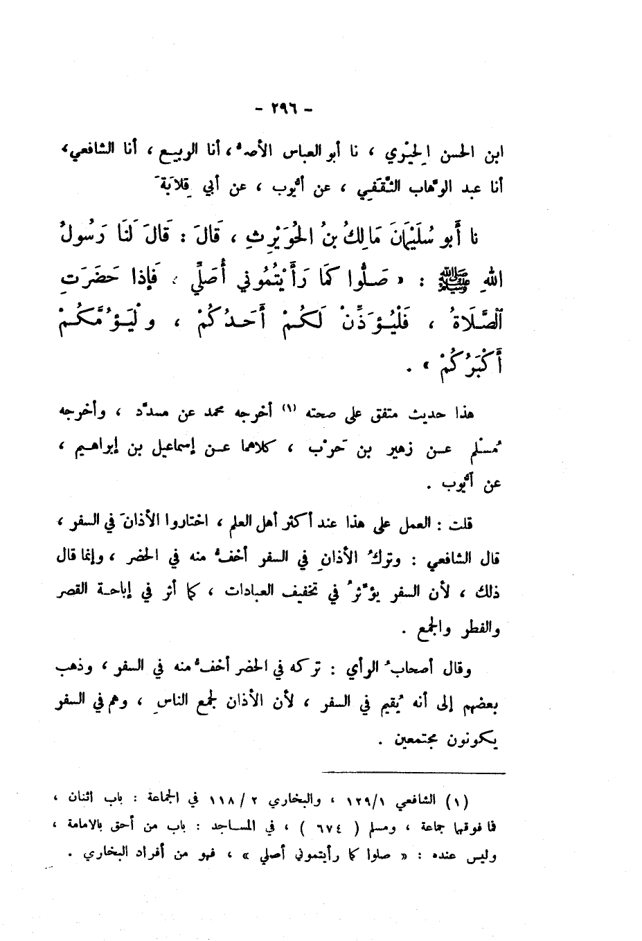 بْنُ الْحَسَنِ الْحِيرِيُّ، نَا أَبُو الْعَبَّاسِ الأَصَمُّ، أَنَا الرَّبِيعُ، أَنَا الشَّافِعِيُّ، أَنَا عَبْدُ الْوَهَّابِ الثَّقَفِيُّ، عَنْ أَيُّوبَ، عَنْ أَبِي قِلابَةَ، نَا أَبُو سُلَيْمَانَ مَالِكُ بْنُ الْحُوَيْرِثِ، قَالَ: قَالَ لَنَا رَسُولُ اللَّهِ صَلَّى اللهُ عَلَيْهِ وَسَلَّمَ: «صَلُّوا كَمَا رَأَيْتُمُونِي أُصَلِّي، فَإِذَا حَضَرَتِ الصَّلاةُ، فَلْيُؤَذِّنْ لَكُمْ أَحَدُكُمْ، وَلْيَؤُمَّكُمْ أَكْبَرُكُمْ».