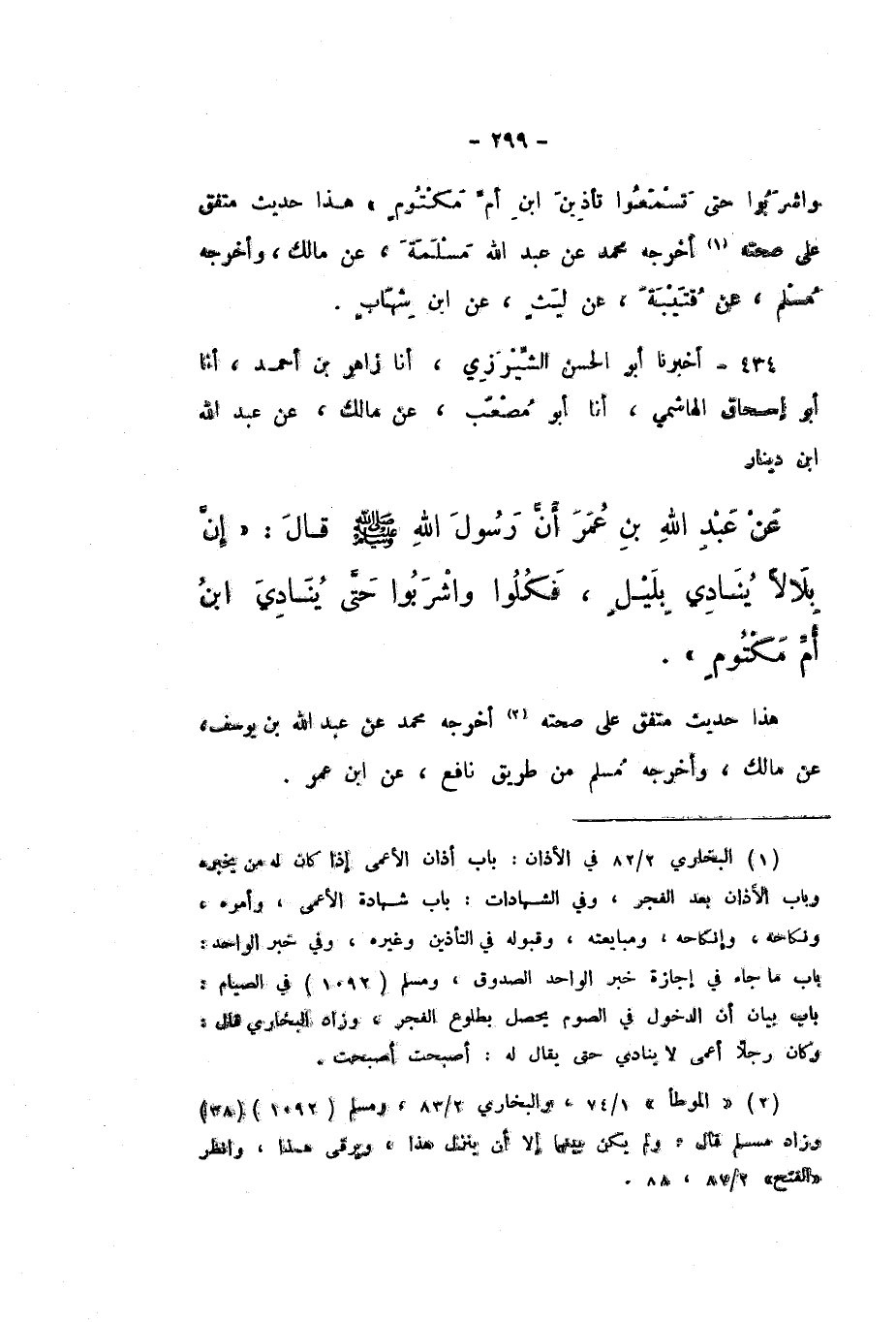 434 - أَخْبَرَنَا أَبُو الْحَسَنِ الشِّيرَزِيُّ، أَنَا زَاهِرُ بْنُ أَحْمَدَ، أَنَا أَبُو إِسْحَاقَ الْهَاشِمِيُّ، أَنَا أَبُو مُصْعَبٍ، عَنْ مَالِكٍ، عَنْ عَبْدِ اللَّهِ بْنِ دِينَارٍ، عَنْ عَبْدِ اللَّهِ بْنِ عُمَرَ، أَنَّ رَسُولَ اللَّهِ صَلَّى اللهُ عَلَيْهِ وَسَلَّمَ، قَالَ: «إِنَّ بِلالا يُنَادِي بِلَيْلٍ، فَكُلُوا وَاشْرَبُوا حَتَّى يُنَادِيَ ابْنُ أُمِّ مَكْتُومٍ».