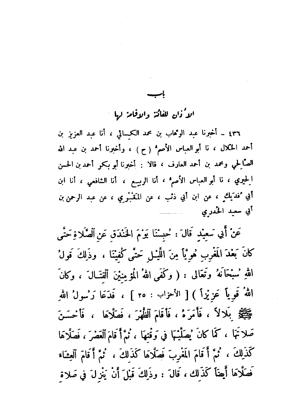 ح وَأَخْبَرَنَا أَحْمَدُ بْنُ عَبْدِ اللَّهِ الصَّالِحِيُّ، وَمُحَمَّدُ بْنُ أَحْمَدَ الْعَارِفُ، قَالا: أَخْبَرَنَا أَبُو بَكْرٍ أَحْمَدُ بْنُ الْحَسَنِ الْحِيرِيُّ، نَا أَبُو الْعَبَّاسِ الأَصَمُّ، أَنَا الرَّبِيعُ، أَنَا الشَّافِعِيُّ، أَنَا ابْنُ أَبِي فُدَيْكٍ، عَنِ ابْنِ أَبِي ذِئْبٍ، عَنِ الْمَقْبُرِيِّ، عَنْ عَبْدِ الرَّحْمَنِ بْنِ أَبِي سَعِيدٍ الْخُدْرِيِّ، عَنْ أَبِي سَعِيدٍ، قَالَ: " حُبِسْنَا يَوْمَ الْخَنْدَقِ عَنِ الصَّلاةِ، حَتَّى كَانَ بَعْدَ الْمَغْرِبِ هُوِيًّا مِنَ اللَّيْلِ حَتَّى كُفِينَا، وَذَلِكَ قَوْلُ اللَّهِ سُبْحَانَهُ وَتَعَالَى: {وَكَفَى اللَّهُ الْمُؤْمِنِينَ الْقِتَالَ وَكَانَ اللَّهُ قَوِيًّا عَزِيزًا} [الْأَحْزَاب: 25]، فَدَعَا رَسُولُ اللَّهِ صَلَّى اللهُ عَلَيْهِ وَسَلَّمَ بِلالا، فَأَمَرَهُ، فَأَقَامَ الظُّهْرَ، فَصَلاهَا، فَأَحْسَنَ صَلاتَهَا، كَمَا كَانَ يُصَلِّيهَا فِي وَقْتِهَا، ثُمَّ أَقَامَ الْعَصْرَ، فَصَلاهَا كَذَلِكَ، ثُمَّ أَقَامَ الْمَغْرِبَ فَصَلاهَا كَذَلِكَ، ثُمَّ أَقَامَ الْعِشَاءَ فَصَلاهَا أَيْضًا كَذَلِكَ، قَالَ: وَذَلِكَ قَبْلَ أَنْ يَنْزِلَ فِي صَلاةِ