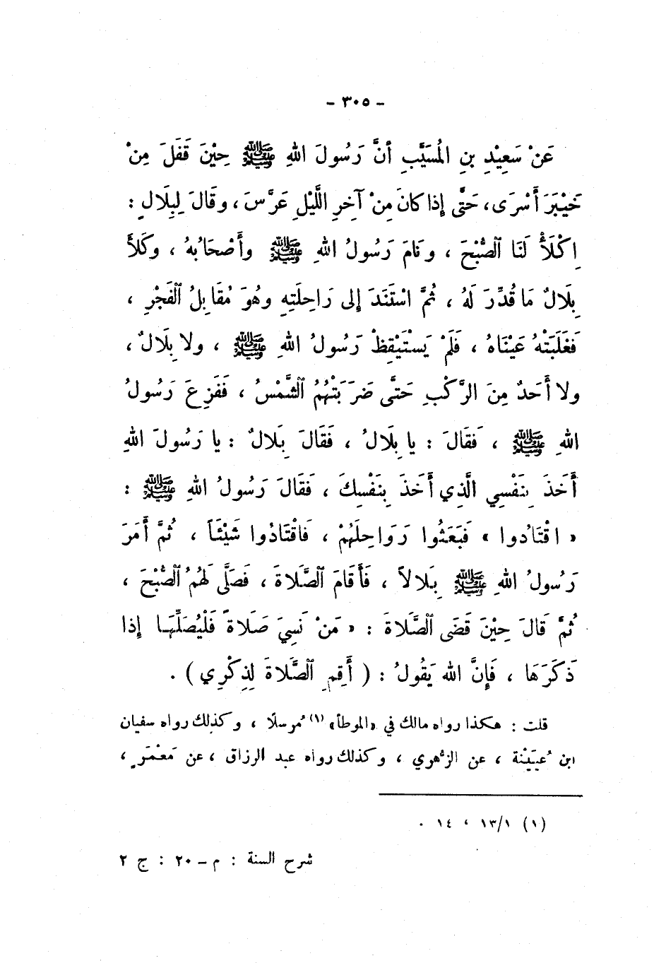 عَنْ سَعِيدِ بْنِ الْمُسَيِّبِ، أَنَّ رَسُولَ اللَّهِ صَلَّى اللهُ عَلَيْهِ وَسَلَّمَ حِينَ قَفَلَ مِنْ خَيْبَرَ أَسْرَى، حَتَّى إِذَا كَانَ مِنْ آخِرِ اللَّيْلِ عَرَّسَ، وَقَالَ لِبِلالٍ: «اكْلَأْ لَنَا الصُّبْحَ»، وَنَامَ رَسُولُ اللَّهِ صَلَّى اللهُ عَلَيْهِ وَسَلَّمَ وَأَصْحَابُهُ، وَكَلأَ بِلالٌ مَا قُدِّرَ لَهُ، ثُمَّ اسْتَنَدَ إِلَى رَاحِلَتِهِ وَهُوَ مُقَابِلُ الْفَجْرِ، فَغَلَبَتْهُ عَيْنَاهُ، فَلَمْ يَسْتَيْقِظْ رَسُولُ اللَّهِ صَلَّى اللهُ عَلَيْهِ وَسَلَّمَ، وَلا بِلالٌ، وَلا أَحَدٌ مِنَ الرَّكْبِ، حَتَّى ضَرَبَتْهُمُ الشَّمْسُ، فَفَزِعَ رَسُولُ اللَّهِ صَلَّى اللهُ عَلَيْهِ وَسَلَّمَ، فَقَالَ: «يَا بِلالُ»، فَقَالَ بِلالٌ: يَا رَسُولَ اللَّهِ، أَخَذَ بِنَفْسِي الَّذِي أَخَذَ بِنَفْسِكَ، فَقَالَ رَسُولُ اللَّهِ صَلَّى اللهُ عَلَيْهِ وَسَلَّمَ: «اقْتَادُوا»، فَبَعَثُوا رَوَاحِلَهُمْ، فَاقْتَادُوا شَيْئًا، ثُمَّ أَمَرَ رَسُولُ اللَّهِ صَلَّى اللهُ عَلَيْهِ وَسَلَّمَ بِلالا، فَأَقَامَ الصَّلاةَ، فَصَلَّى لَهُمُ الصُّبْحَ، ثُمَّ قَالَ حِينَ قَضَى الصَّلاةَ: " مَنْ نَسِيَ صَلاةً فَلْيُصَلِّهَا إِذَا ذَكَرَهَا، فَإِنَّ اللَّهَ، يَقُولُ: {وَأَقِمِ الصَّلاةَ لِذِكْرِي} [طه: 14] ".