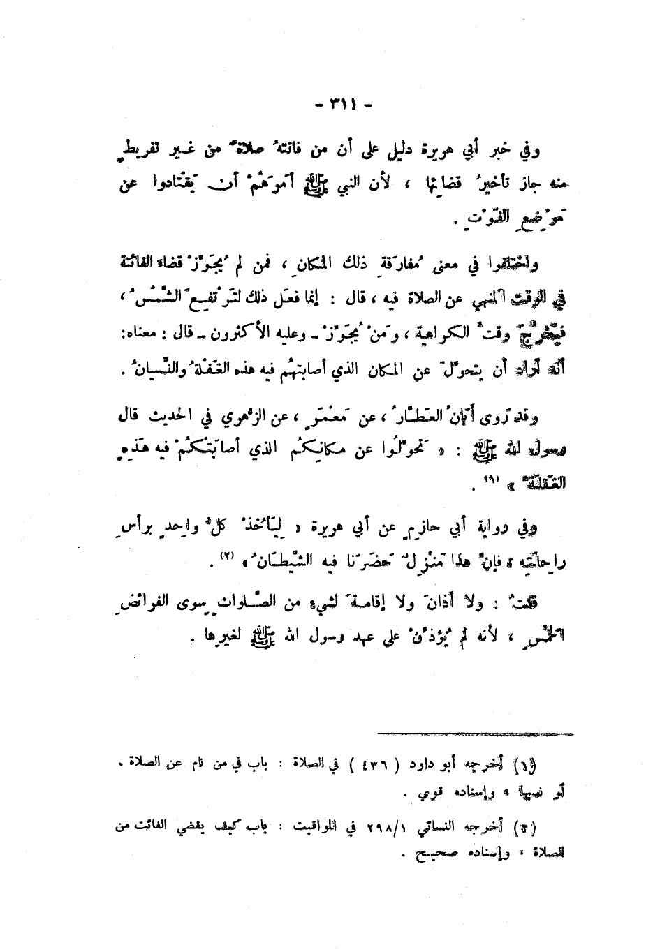 وَفِي خَبَرِ أَبِي هُرَيْرَةَ دَلِيلٌ عَلَى أَنَّ مَنْ فَاتَتْهُ صَلاةٌ مِنْ غَيْرِ تَفْرِيطٍ مِنْهُ، جَازَ تَأْخِيرُ قَضَائِهَا، لأَنَّ النَّبِيَّ صَلَّى اللهُ عَلَيْهِ وَسَلَّمَ أَمَرَهُمْ أَنْ يَقْتَادُوا عَنْ مَوْضِعِ الْفَوْتِ.