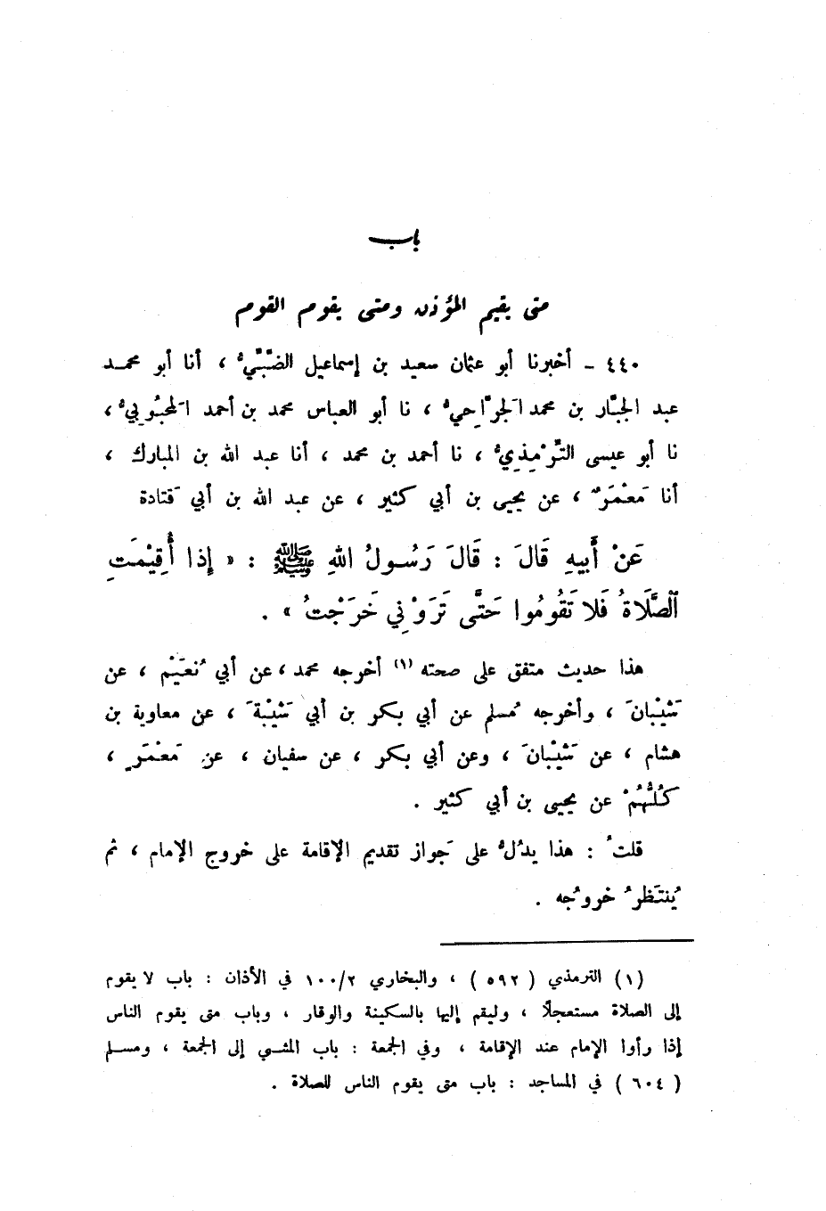 440 - أَخْبَرَنَا أَبُو عُثْمَانَ سَعِيدُ بْنُ إِسْمَاعِيلَ الضَّبِّيُّ، أَنَا أَبُو مُحَمَّدٍ عَبْدُ الْجَبَّارِ بْنُ مُحَمَّدٍ الْجَرَّاحِيُّ، نَا أَبُو الْعَبَّاسِ مُحَمَّدُ بْنُ أَحْمَدَ الْمَحْبُوبِيُّ، نَا أَبُو عِيسَى التِّرْمِذِيُّ، نَا أَحْمَدُ بْنُ مُحَمَّدٍ، أَنَا عَبْدُ اللَّهِ بْنُ الْمُبَارَكِ، أَنَا مَعْمَرٌ، عَنْ يَحْيَى بْنِ أَبِي كَثِيرٍ، عَنْ عَبْدِ اللَّهِ بْنِ أَبِي قَتَادَةَ، عَنْ أَبِيهِ، قَالَ: قَالَ رَسُولُ اللَّهِ صَلَّى اللهُ عَلَيْهِ وَسَلَّمَ: «إِذَا أُقِيمَتِ الصَّلاةُ فَلا تَقُومُوا حَتَّى تَرَوْنِي خَرَجْتُ».