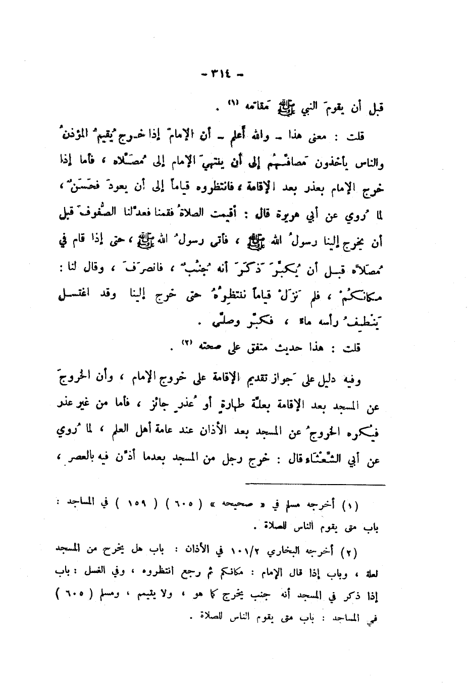 قُلْتُ: مَعْنَى هَذَا، وَاللَّهُ أَعْلَمُ، أَنَّ الإِمَامَ إِذَا خَرَجَ يُقِيمُ الْمُؤَذِّنُ، وَالنَّاسُ يَأْخُذُونَ مَصَافَّهُمْ إِلَى أَنْ يَنْتَهِيَ الإِمَامُ إِلَى مُصَلاهُ، فَأَمَّا إِذَا خَرَجَ الإِمَامُ بِعُذْرٍ بَعْدَ الإِقَامَةِ، فَانْتَظَرُوهُ قِيَامًا إِلَى أَنْ يَعُودَ فَحَسَنٌ، لِمَا رُوِيَ عَنْ أَبِي هُرَيْرَةَ، قَالَ: أُقِيمَتِ الصَّلاةُ فَقُمْنَا فَعَدَّلْنَا الصُّفُوفَ قَبْلَ أَنْ يَخْرُجَ إِلَيْنَا رَسُولُ اللَّهِ صَلَّى اللهُ عَلَيْهِ وَسَلَّمَ، فَأَتَى رَسُولُ اللَّهِ صَلَّى اللهُ عَلَيْهِ وَسَلَّمَ، حَتَّى إِذَا قَامَ فِي مُصَلاهُ قَبْلَ أَنْ يُكَبِّرَ ذَكَرَ أَنَّهُ جُنُبٌ، فَانْصَرَفَ، وَقَالَ لَنَا: مَكَانَكُمْ، فَلَمْ نَزَلْ قِيَامًا نَنْتَظِرُهُ حَتَّى خَرَجَ إِلَيْنَا، وَقَدِ اغْتَسَلَ يَنْطِفُ رَأْسُهُ مَاءً، فَكَبَّرَ وَصَلَّى.