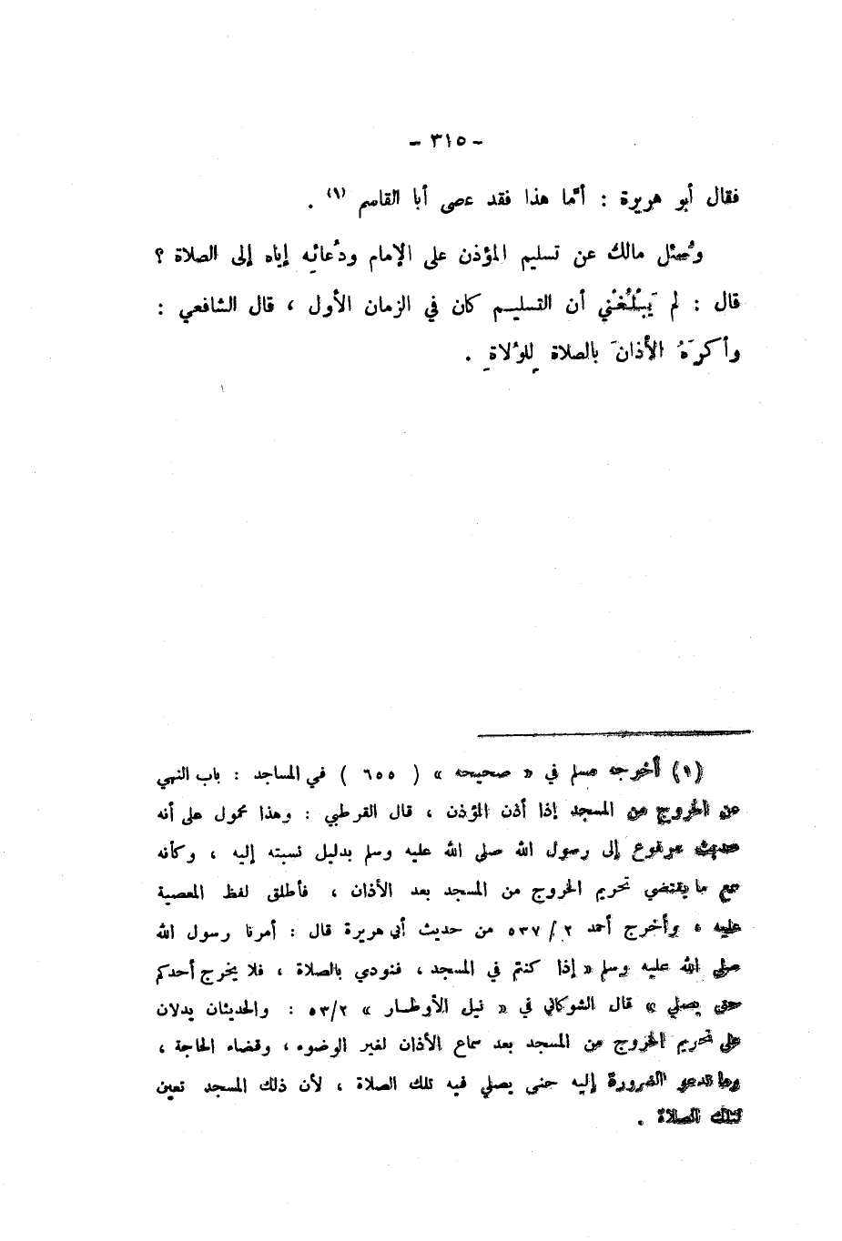 وَسُئِلَ مَالِكٌ عَنْ تَسْلِيمِ الْمُؤَذِّنِ عَلَى الإِمَامِ وَدُعَائِهِ إِيَّاهُ إِلَى الصَّلاةِ؟ قَالَ: لَمْ يَبْلُغْنِي أَنَّ التَّسْلِيمَ كَانَ فِي الزَّمَانِ الأَوَّلِ، قَالَ الشَّافِعِيُّ: وَأَكْرَهُ الأَذَانَ بِالصَّلاةِ لِلْوُلاةِ