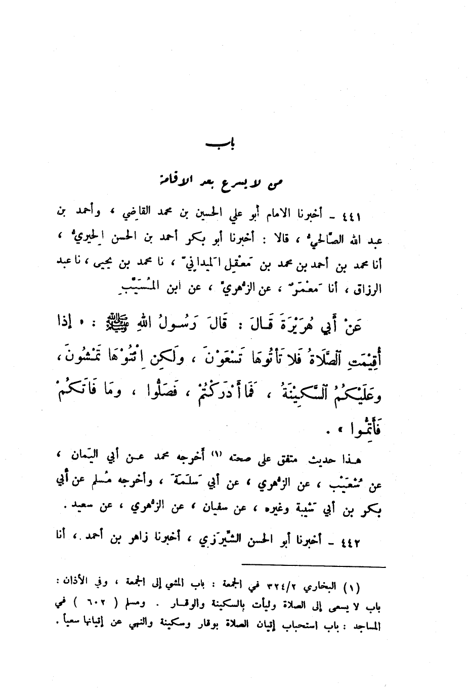 441 - أَخْبَرَنَا الإِمَامُ أَبُو عَلِيٍّ الْحُسَيْنُ بْنُ مُحَمَّدٍ الْقَاضِي، وَأَحْمَدُ بْنُ عَبْدِ اللَّهِ الصَّالِحِيُّ، قَالا: أَخْبَرَنَا أَبُو بَكْرٍ أَحْمَدُ بْنُ الْحَسَنِ الْحِيرِيُّ، أَنَا مُحَمَّدُ بْنُ أَحْمَدَ بْنِ مُحَمَّدِ بْنِ مَعْقِلٍ الْمَيْدَانِيُّ، نَا مُحَمَّدُ بْنُ يَحْيَى، نَا عَبْدُ الرَّزَّاقِ، أَنَا مَعْمَرٌ، عَنِ الزُّهْرِيِّ، عَنِ ابْنِ الْمُسَيَّبِ، عَنْ أَبِي هُرَيْرَةَ، قَالَ: قَالَ رَسُولُ اللَّهِ صَلَّى اللهُ عَلَيْهِ وَسَلَّمَ: «إِذَا أُقِيمَتِ الصَّلاةُ فَلا تَأْتُوهَا تَسْعَوْنَ، وَلَكِنِ ائْتُوهَا تَمْشُونَ، وَعَلَيْكُمُ السَّكِينَةُ، فَمَا أَدْرَكْتُمْ، فَصَلُّوا، وَمَا فَاتَكُمْ فَأَتِمُّوا».