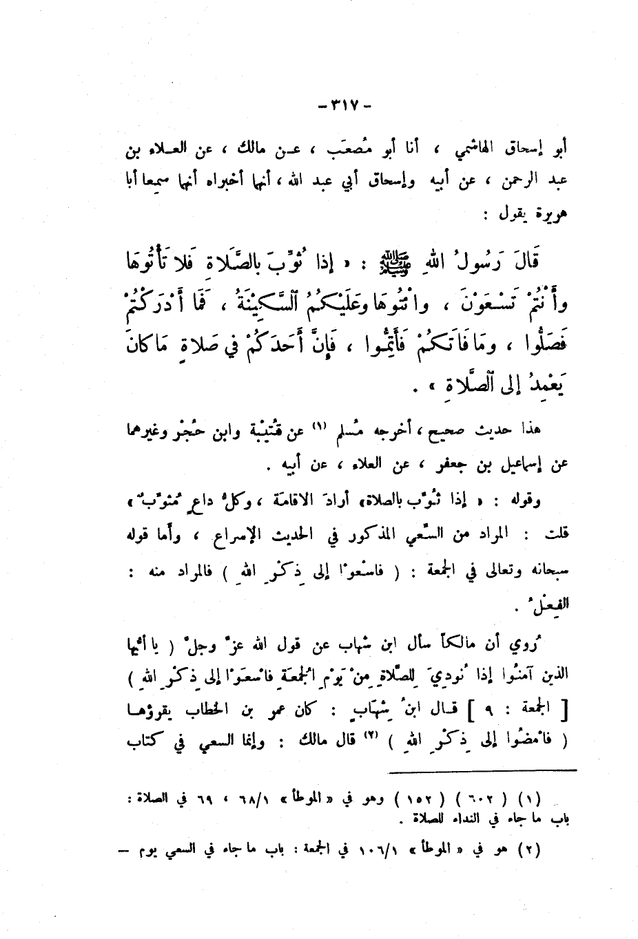 أَبُو إِسْحَاقَ الْهَاشِمِيُّ، أَنَا أَبُو مُصْعَبٍ، عَنْ مَالِكٍ، عَنِ الْعَلاءِ بْنِ عَبْدِ الرَّحْمَنِ، عَنْ أَبِيهِ، وَإِسْحَاقَ أَبِي عَبْدِ اللَّهِ، أَنَّهُمَا أَخْبَرَاهُ أَنَّهُمَا، سَمِعَا أَبَا هُرَيْرَةَ، يَقُولُ: قَالَ رَسُولُ اللَّهِ صَلَّى اللهُ عَلَيْهِ وَسَلَّمَ: «إِذَا ثُوِّبَ بِالصَّلاةِ فَلا تَأْتُوهَا وَأَنْتُمْ تَسْعَوْنَ، وَائْتُوهَا وَعَلَيْكُمُ السِّكِينَةُ، فَمَا أَدْرَكْتُمْ فَصَلُّوا، وَمَا فَاتَكُمْ فَأَتِمُّوا، فَإِنَّ أَحَدَكُمْ فِي صَلاةٍ مَا كَانَ يَعْمِدُ إِلَى الصَّلاةِ».