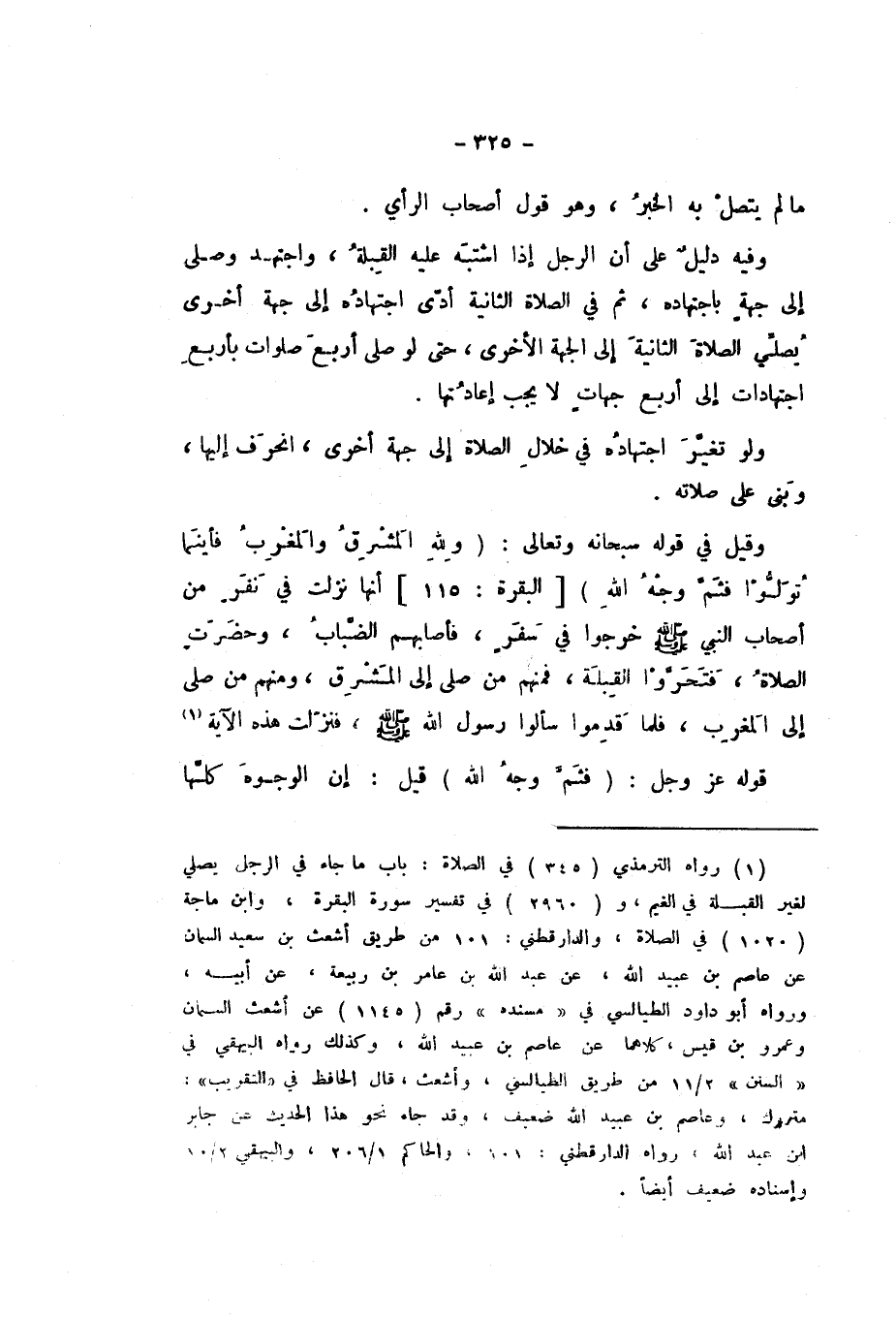 وَفِيهِ دَلِيلٌ عَلَى أَنَّ الرَّجُلَ إِذَا اشْتَبَهَ عَلَيْهِ الْقِبْلَةُ، وَاجْتَهَدَ وَصَلَّى إِلَى جِهَةٍ بِاجْتِهَادِهِ، ثُمَّ فِي الصَّلاةِ الثَّانِيَةِ أَدَّى اجْتِهَادُهُ إِلَى جِهَةٍ أُخْرَى، يُصَلِّي الصَّلاةَ الثَّانِيَةَ إِلَى الْجِهَةِ الأُخْرَى، حَتَّى لَوْ صَلَّى أَرْبَعَ صَلَوَاتٍ بِأَرْبَعِ اجْتِهَادَاتٍ إِلَى أَرْبَعِ جِهَاتٍ، لَا يَجِبُ إِعَادَتُهَا.