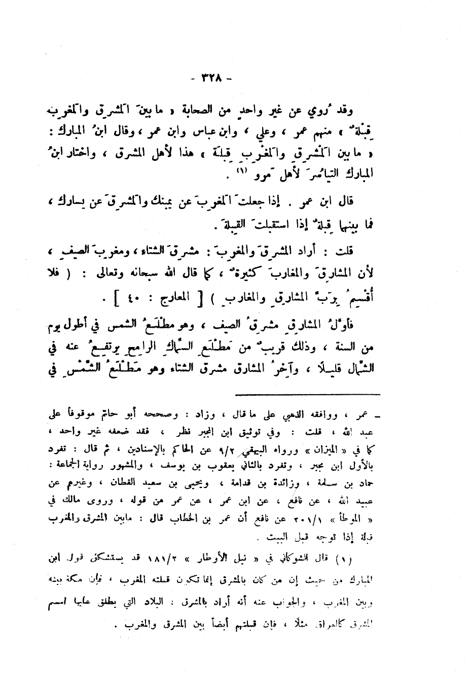 وَقَدْ رُوِيَ عَنْ غَيْرِ وَاحِدٍ مِنَ الصَّحَابَةِ «مَا بَيْنَ الْمَشْرِقِ وَالْمَغْرِبِ قِبْلَةٌ»، مِنْهُمْ: عُمَرُ، وَعَلِيٌّ، وَابْنُ عَبَّاسٍ، وَابْنُ عُمَرَ، وَقَالَ ابْنُ الْمُبَارَكِ: «مَا بَيْنَ الْمَشْرِقِ وَالْمَغْرِبِ قِبْلَةٌ» هَذَا لأَهْلِ الْمَشْرِقِ، وَاخْتَارَ ابْنُ الْمُبَارَكِ التَّيَاسُرَ لأَهْلِ مَرْوَ.