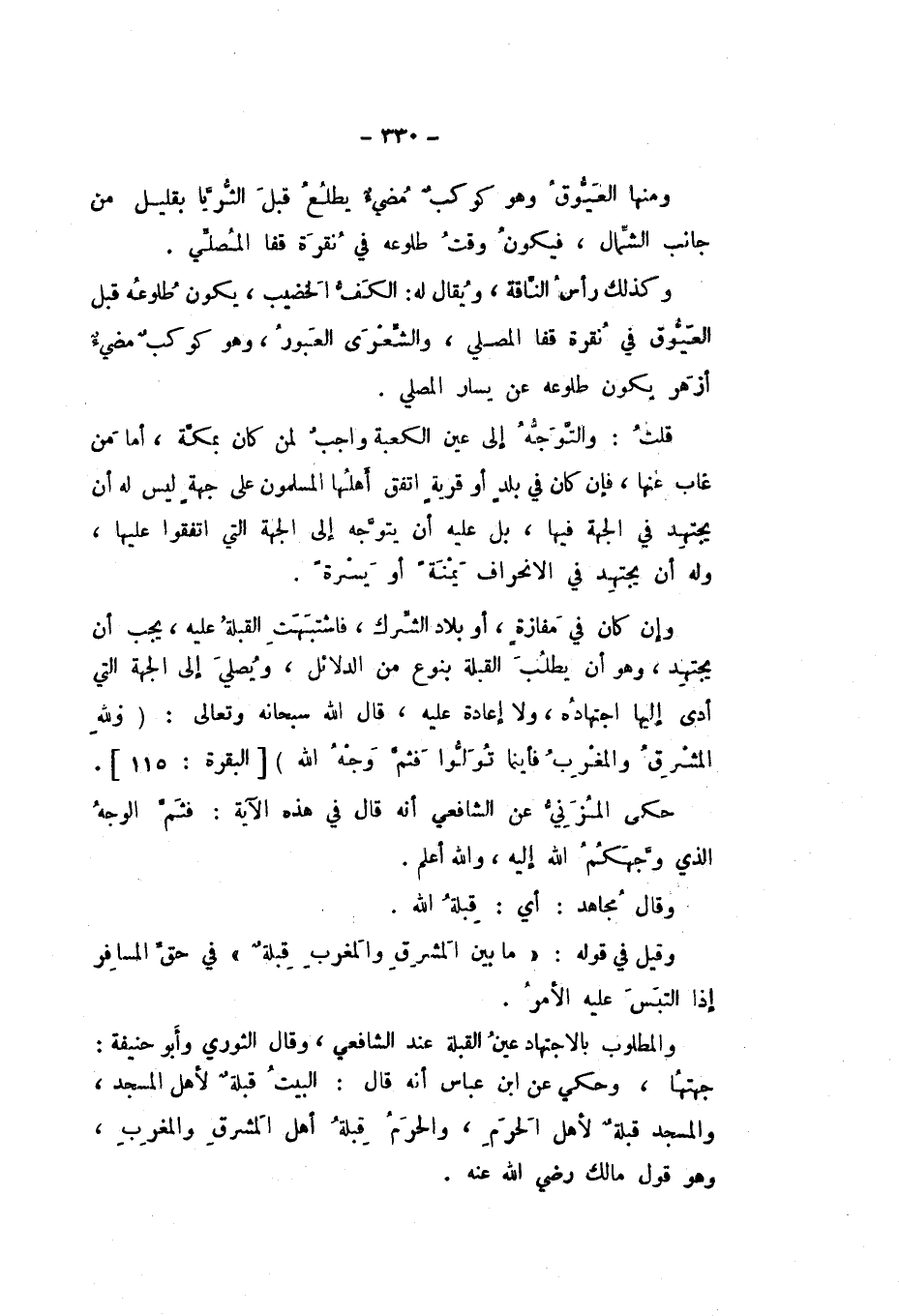 وَحُكِيَ عَنِ ابْنِ عَبَّاسٍ، أَنَّهُ قَالَ: «الْبَيْتُ قِبْلَةٌ لأَهْلِ الْمَسْجِدِ، وَالْمَسْجِدُ قِبْلَةٌ لأَهْلِ الْحَرَمِ، وَالْحَرَمُ قِبْلَةُ أَهْلِ الْمَشْرِقِ وَالْمَغْرِبِ»، وَهُوَ قَوْلُ مَالِكٍ رَضِيَ اللَّهُ عَنْهُ.