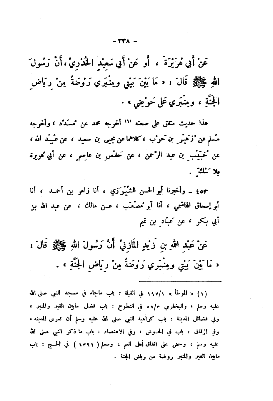 453 - وَأَخْبَرَنَا أَبُو الْحَسَنِ الشِّيرَزِيُّ، أَنَا زَاهِرُ بْنُ أَحْمَدَ، أَنَا أَبُو إِسْحَاقَ الْهَاشِمِيُّ، أَنَا أَبُو مُصْعَبٍ، عَنْ مَالِكٍ، عَنْ عَبْدِ اللَّهِ بْنِ أَبِي بَكْرٍ، عَنْ عَبَّادِ بْنِ تَمِيمٍ، عَنْ عَبْدِ اللَّهِ بْنِ زَيْدٍ الْمَازِنِيِّ، أَنَّ رَسُولَ اللَّهِ صَلَّى اللهُ عَلَيْهِ وَسَلَّمَ، قَالَ: «مَا بَيْنَ بَيْتِي وَمِنْبَرِي رَوْضَةٌ مِنْ رِيَاضِ الْجَنَّةِ».