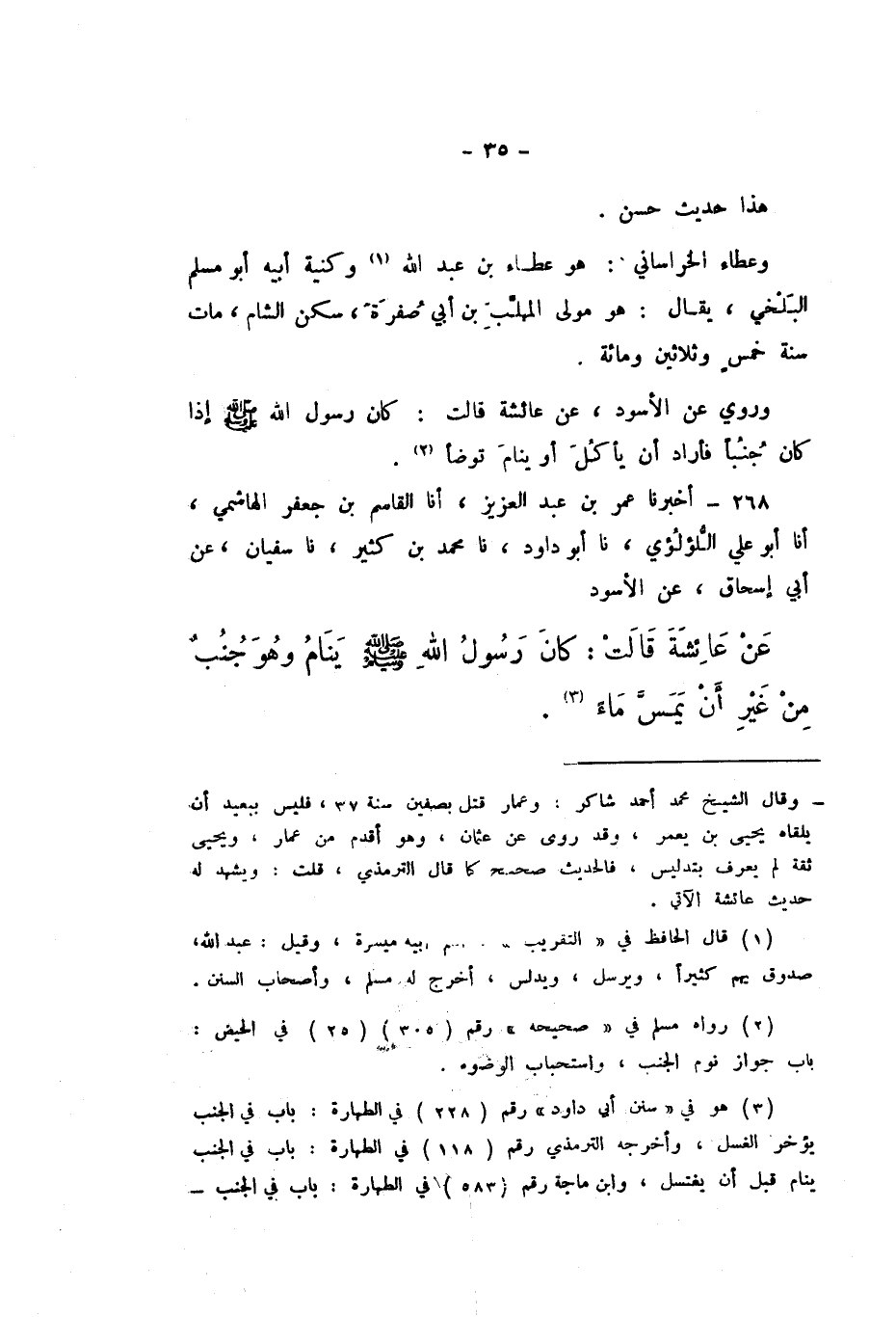 268 - أَخْبَرَنَا عُمَرُ بْنُ عَبْدِ الْعَزِيزِ، أَنا الْقَاسِمُ بْنُ جَعْفَرٍ الْهَاشِمِيُّ، أَنا أَبُو عَلِيٍّ اللُّؤْلُئِيُّ، نَا أَبُو دَاوُدَ، نَا مُحَمَّدُ بْنُ كَثِيرٍ، نَا سُفْيَانُ، عَنْ أَبِي إِسْحَاقَ، عَنِ الأَسْوَدِ، عَنْ عَائِشَةَ، قَالَتْ: «كَانَ رَسُولُ اللَّهِ صَلَّى اللهُ عَلَيْهِ وَسَلَّمَ يَنَامُ وَهُوَ جُنُبٌ مِنْ غَيْرِ أَنْ يَمَسَّ مَاءً»