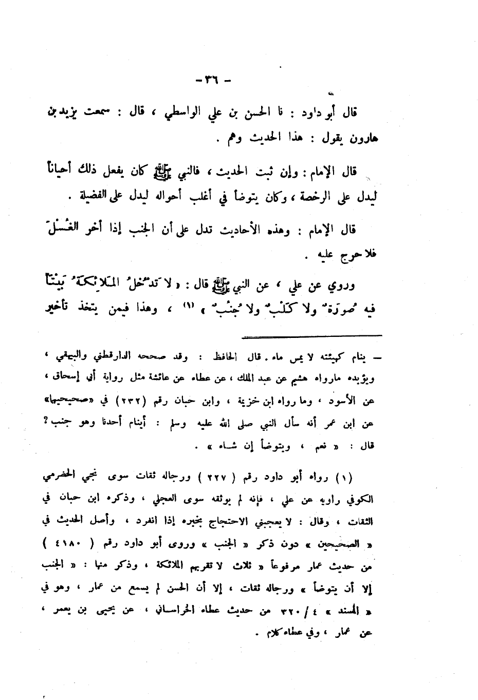 وَرُوِيَ عَنْ عَلِيٍّ، عَنِ النَّبِيِّ صَلَّى اللهُ عَلَيْهِ وَسَلَّمَ قَالَ: «لَا تَدْخُلُ الْمَلائِكَةُ بَيْتًا فِيهِ صُورَةٌ وَلا كَلْبٌ وَلا جُنُبٌ»، وَهَذَا فِيمَنْ يَتَّخِذُ تَأْخِيرَ