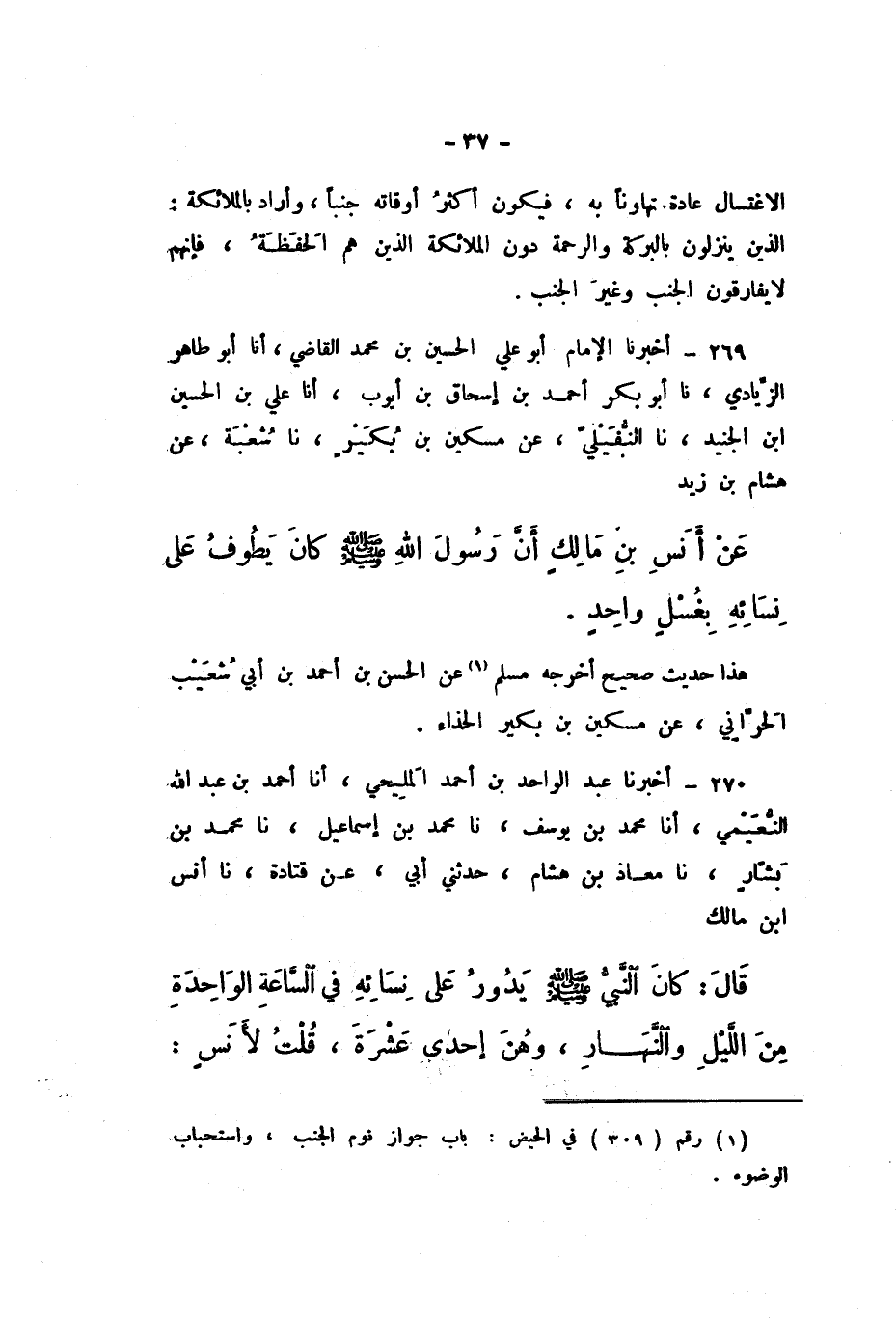 269 - أَخْبَرَنَا الإِمَامُ أَبُو عَلِيٍّ الْحُسَيْنُ بْنُ مُحَمَّدٍ الْقَاضِي، أَنا أَبُو طَاهِرٍ الزِّيَادِيُّ، نَا أَبُو بَكْرٍ أَحْمَدُ بْنُ إِسْحَاقَ بْنِ أَيُّوبَ، أَنا عَلِيُّ بْنُ الْحُسَيْنِ بْنِ الْجُنَيْدِ، نَا النُّفَيْلِيُّ، عَنْ مِسْكِينِ بْنِ بُكَيْرٍ، نَا شُعْبَةُ، عَنْ هِشَامِ بْنِ زَيْدٍ، عَنْ أَنَسِ بْنِ مَالِكٍ، «أَنَّ رَسُولَ اللَّهِ صَلَّى اللهُ عَلَيْهِ وَسَلَّمَ كَانَ يَطُوفُ عَلَى نِسَائِهِ بِغُسْلٍ وَاحِدٍ».
