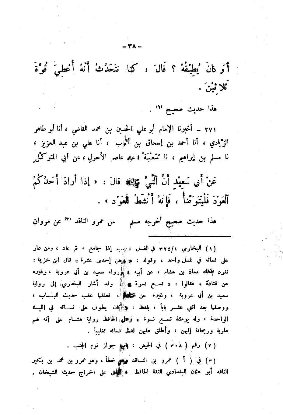 271 - أَخْبَرَنَا الإِمَامُ أَبُو عَلِيٍّ الْحُسَيْنُ بْنُ مُحَمَّدٍ الْقَاضِي، أَنا أَبُو طَاهِرٍ الزِّيَادِيُّ، أَنا أَحْمَدُ بْنُ إِسْحَاقَ بْنِ أَيُّوبَ، أَنا عَلِيُّ بْنُ عَبْدِ الْعَزِيزِ، نَا مُسْلِمُ بْنُ إِبْرَاهِيمَ، نَا شُعْبَةُ، عَنْ عَاصِمٍ الأَحْوَلِ، عَنْ أَبِي الْمُتَوَكِّلِ، عَنْ أَبِي سَعِيدٍ، أَنَّ النَّبِيَّ صَلَّى اللهُ عَلَيْهِ وَسَلَّمَ، قَالَ: «إِذَا أَرَادَ أَحَدُكُمُ الْعَوْدَ فَلْيَتَوَضَّأْ، فَإِنَّهُ أَنْشَطُ لِلْعَوْدِ».