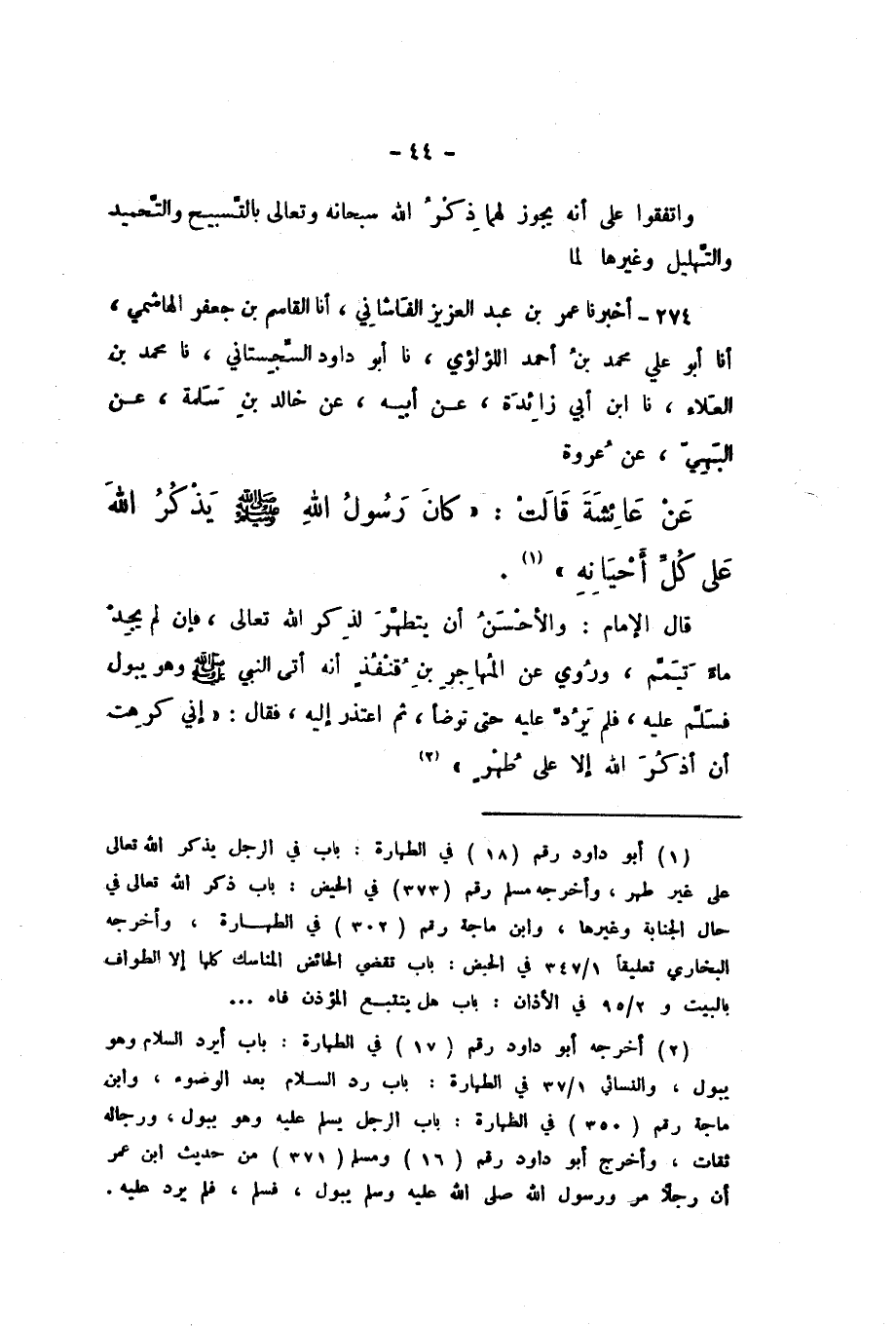 274 - أَخْبَرَنَا عُمَرُ بْنُ عَبْدِ الْعَزِيزِ الْفَاشَانِيُّ، أَنا الْقَاسِمُ بْنُ جَعْفَرٍ الْهَاشِمِيُّ، أَنا أَبُو عَلِيٍّ مُحَمَّدُ بْنُ أَحْمَدَ اللُّؤْلُئِيُّ، نَا أَبُو دَاوُدَ السِّجِسْتَانِيُّ، نَا مُحَمَّدُ بْنُ الْعَلاءِ، نَا ابْنُ أَبِي زَائِدَةَ، عَنْ أَبِيهِ، عَنْ خَالِدِ بْنِ سَلَمَةَ، عَنِ الْبَهِيِّ، عَنْ عُرْوَةَ، عَنْ عَائِشَةَ، قَالَتْ: «كَانَ رَسُولُ اللَّهِ صَلَّى اللهُ عَلَيْهِ وَسَلَّمَ يَذْكُرُ اللَّهَ عَلَى كُلِّ أَحْيَانِهِ»
