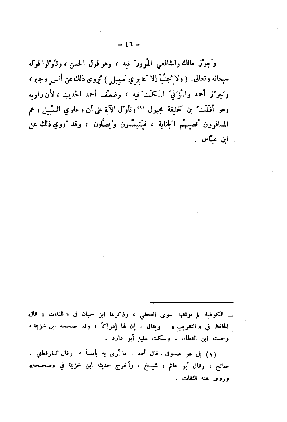 وَجَوَّزَ أَحْمَدُ، وَالْمُزَنِيُّ الْمَكْثَ فِيهِ، وَضَعَّفَ أَحْمَدُ الْحَدِيثَ، لأَنَّ رَاوِيَهُ أَفْلَتُ بْنُ خَلِيفَةَ مَجْهُولٌ، وَتَأَوَّلَ الآيَةَ عَلَى أَنَّ {عَابِرِي سَبِيلٍ} [النِّسَاء: 43] هُمُ الْمُسَافِرُونَ تُصِيبُهُمُ الْجَنَابَةَ، فَيَتَيَمَّمُونَ وَيُصَلُّونَ، وَقَدْ رُوِيَ ذَلِكَ عَنِ ابْنِ عَبَّاسٍ.