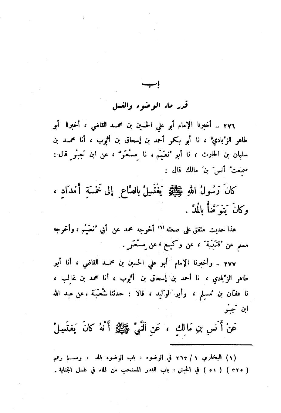 276 - أَخْبَرَنَا الإِمَامُ أَبُو عَلِيٍّ الْحُسَيْنُ بْنُ مُحَمَّدٍ الْقَاضِي، أَخْبَرَنَا أَبُو طَاهِرٍ الزِّيَادِيُّ، نَا أَبُو بَكْرٍ أَحْمَدُ بْنُ إِسْحَاقَ بْنِ أَيُّوبَ، أَنا مُحَمَّدُ بْنُ سُلَيْمَانَ بْنِ الْحَارِثِ، نَا أَبُو نُعَيْمٍ، نَا مِسْعَرٌ، عَنِ ابْنِ جَبْرٍ، قَالَ: سَمِعْتُ أَنَسَ بْنَ مَالِكٍ، قَالَ: «كَانَ رَسُولُ اللَّهِ صَلَّى اللهُ عَلَيْهِ وَسَلَّمَ يَغْتَسِلُ بِالصَّاعِ إِلَى خَمْسَةِ أَمْدَادٍ، وَكَانَ يَتَوَضَّأُ بِالْمُدِّ».