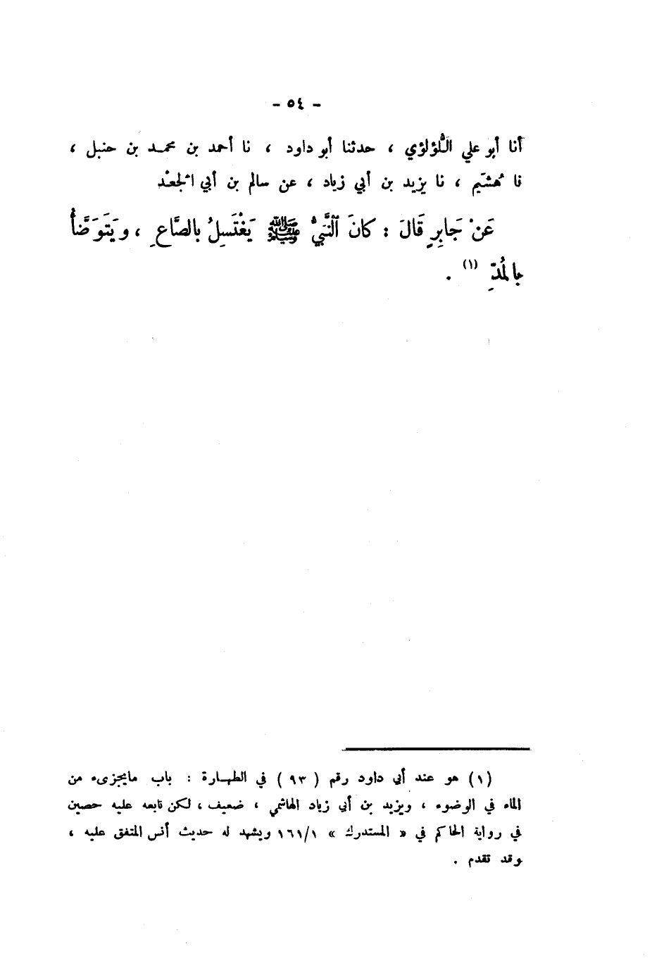 أَنا أَبُو عَلِيٍّ اللُّؤْلُئِيُّ، حَدَّثَنَا أَبُو دَاوُدَ، نَا أَحْمَدُ بْنُ مُحَمَّدِ بْنِ حَنْبَلٍ، نَا هُشَيْمٌ، نَا يَزِيدُ بْنُ أَبِي زِيَادٍ، عَنْ سَالِمِ بْنِ أَبِي الْجَعْدِ، عَنْ جَابِرٍ، قَالَ: «كَانَ النَّبِيُّ صَلَّى اللهُ عَلَيْهِ وَسَلَّمَ يَغْتَسِلُ بِالصَّاعِ، وَيَتَوَضَّأُ بِالْمُدِّ»