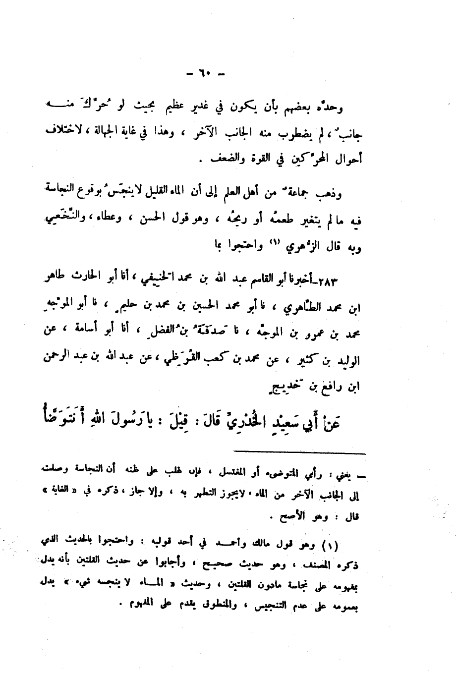 283 - أَخْبَرَنَا أَبُو الْقَاسِمِ عَبْدُ اللَّهِ بْنُ مُحَمَّدٍ الْحَنِيفِيُّ، أَنا أَبُو الْحَارِثِ طَاهِرُ بْنُ مُحَمَّدٍ الطَّاهِرِيُّ، نَا أَبُو مُحَمَّدٍ الْحُسَيْنُ بْنُ مُحَمَّدِ بْنِ حَلِيمٍ، نَا أَبُو الْمُوَجِّهِ مُحَمَّدُ بْنُ عَمْرِو بْنِ الْمُوَجِّهِ، نَا صَدَقَةُ بْنُ الْفَضْلِ، أَنا أَبُو أُسَامَةَ، عَنِ الْوَلِيدِ بْنِ كَثِيرٍ، عَنْ مُحَمَّدِ بْنِ كَعْبٍ الْقُرَظِيِّ، عَنْ عَبْدِ اللَّهِ بْنِ عَبْدِ الرَّحْمَنِ بْنِ رَافِعِ بْنِ خَدِيجٍ، عَنْ أَبِي سَعِيدٍ الْخُدْرِيِّ، قَالَ: قِيلَ: يَا رَسُولَ اللَّهِ، أَنَتَوَضَّأُ