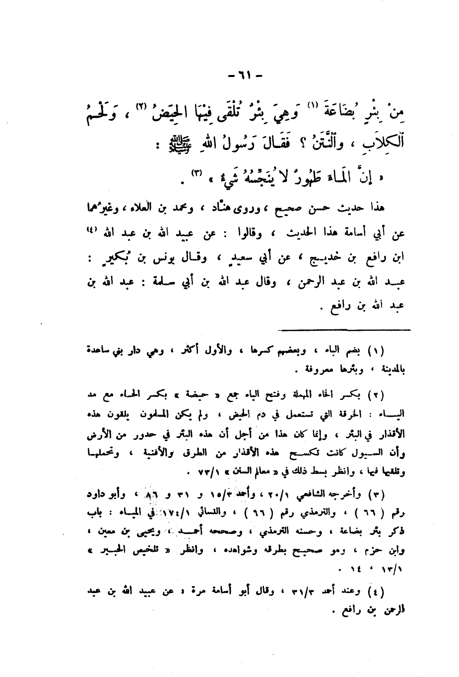 مِنْ بِئْرِ بُضَاعَةَ، وَهِيَ بِئْرٌ تُلْقَى فِيهَا الْحِيَضُ، وَلَحْمُ الْكِلابِ، وَالنَّتْنُ؟ فَقَالَ رَسُولُ اللَّهِ صَلَّى اللهُ عَلَيْهِ وَسَلَّمَ: «إِنَّ الْمَاءَ طَهُورٌ لَا يُنَجِّسُهُ شَيْءٌ».