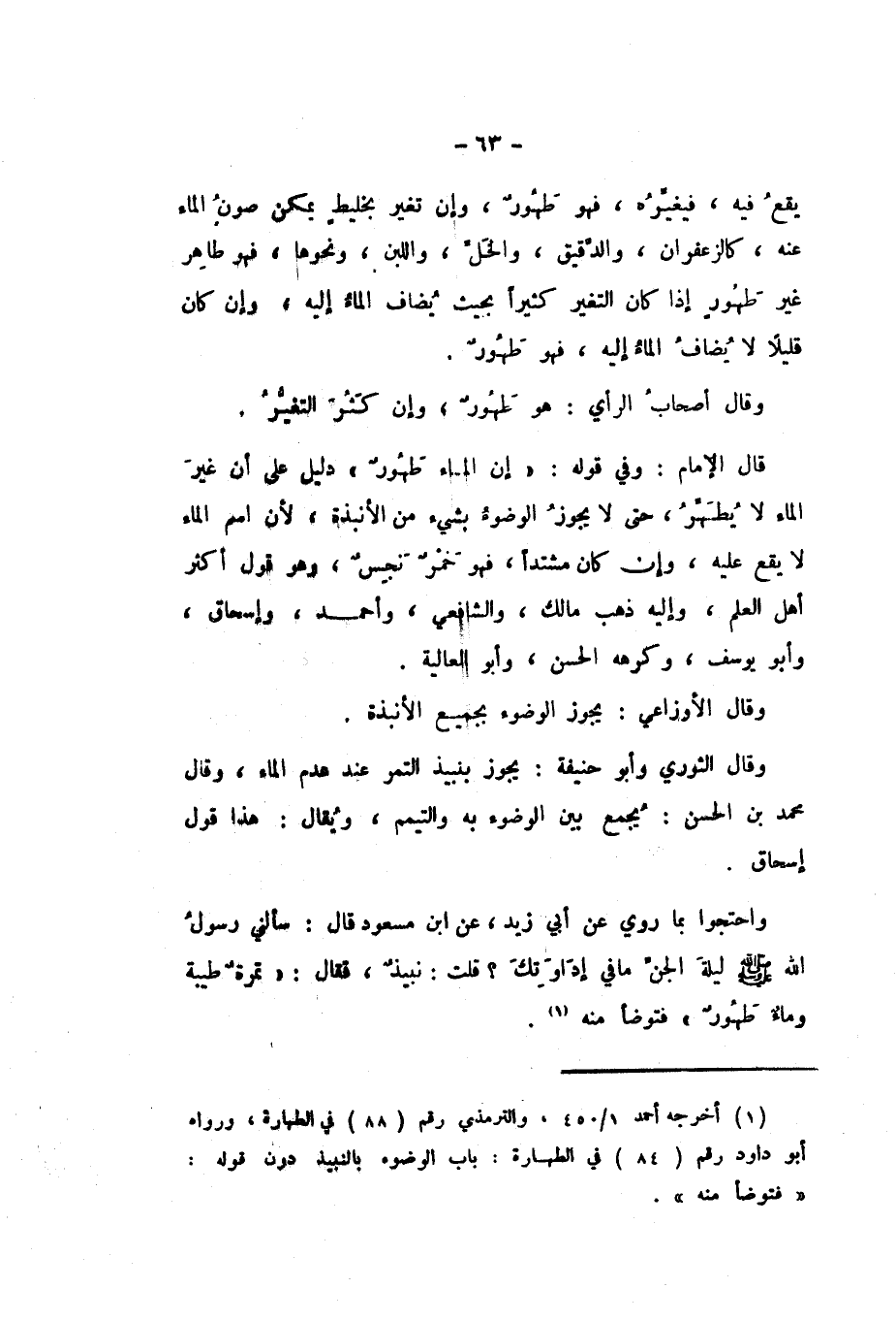 قَالَ الإِمَامُ: وَفِي قَوْلِهِ: «إِنَّ الْمَاءَ طَهُورٌ» دَلِيلٌ عَلَى أَنَّ غَيْرَ الْمَاءِ لَا يُطَهِّرُ، حَتَّى لَا يَجُوزُ الْوُضُوءُ بِشَيْءٍ مِنَ الأَنْبِذَةِ، لأَنَّ اسْمَ الْمَاءِ لَا يَقَعُ عَلَيْهِ، وَإِنْ كَانَ مُشْتَدًّا، فَهُوَ خَمْرٌ نَجِسٌ، وَهُوَ قَوْلُ أَكْثَرِ أَهْلِ الْعِلْمِ، وَإِلَيْهِ ذَهَبَ مَالِكٌ، وَالشَّافِعِيُّ، وَأَحْمَدُ، وَإِسْحَاقُ، وَأَبُو يُوسُفَ، وَكَرِهَهُ الْحَسَنُ، وَأَبُو الْعَالِيَةِ.