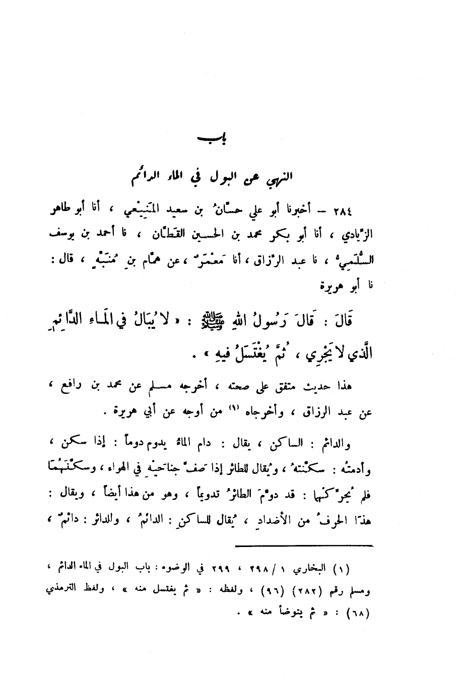 284 - أَخْبَرَنَا أَبُو عَلِيٍّ حَسَّانُ بْنُ سَعِيدٍ الْمَنِيعِيُّ، أَنا أَبُو طَاهِرٍ الزِّيَادِيُّ، أَنا أَبُو بَكْرٍ مُحَمَّدُ بْنُ الْحُسَيْنِ الْقَطَّانُ، نَا أَحْمَدُ بْنُ يُوسُفَ السُّلَمِيُّ، نَا عَبْدُ الرَّزَّاقِ، أَنا مَعْمَرٌ، عَنْ هَمَّامِ بْنِ مُنَبِّهٍ، قَالَ: نَا أَبُو هُرَيْرَةَ، قَالَ: قَالَ رَسُولُ اللَّهِ صَلَّى اللهُ عَلَيْهِ وَسَلَّمَ: «لَا يُبَالُ فِي الْمَاءِ الدَّائِمِ الَّذِي لَا يَجْرِي، ثُمَّ يُغْتَسَلُ بِهِ».