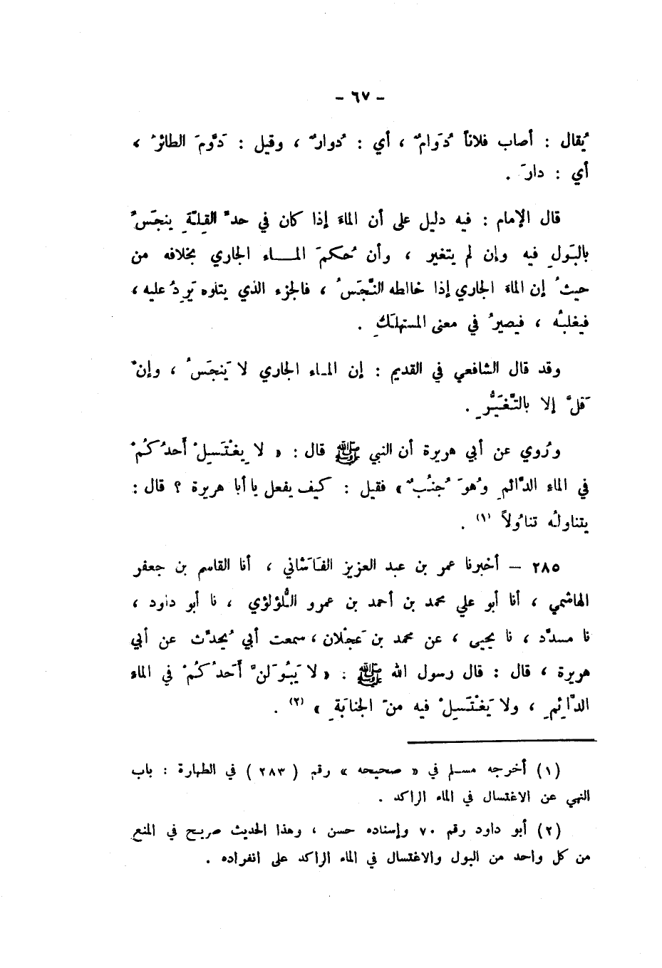 285 - أَخْبَرَنَا عُمَرُ بْنُ عَبْدِ الْعَزِيزِ الْفَاشَانِيُّ، أَنا الْقَاسِمُ بْنُ جَعْفَرٍ الْهَاشِمِيُّ، أَنا أَبُو عَلِيٍّ مُحَمَّدُ بْنُ عَمْرٍو اللُّؤْلُئِيُّ، نَا أَبُو دَاوُدَ، نَا مُسَدَّدٌ، نَا يَحْيَى، عَنْ مُحَمَّدِ بْنِ عَجْلانَ، سَمِعْتُ أَبِي، يُحَدِّثُ عَنْ أَبِي هُرَيْرَةَ، قَالَ: قَالَ رَسُولُ اللَّهِ صَلَّى اللهُ عَلَيْهِ وَسَلَّمَ: «لَا يَبُولَنَّ أَحَدُكُمْ فِي الْمَاءِ الدَّائِمِ، وَلا يَغْتَسِلْ فِيهِ مِنَ الْجَنَابَةِ»