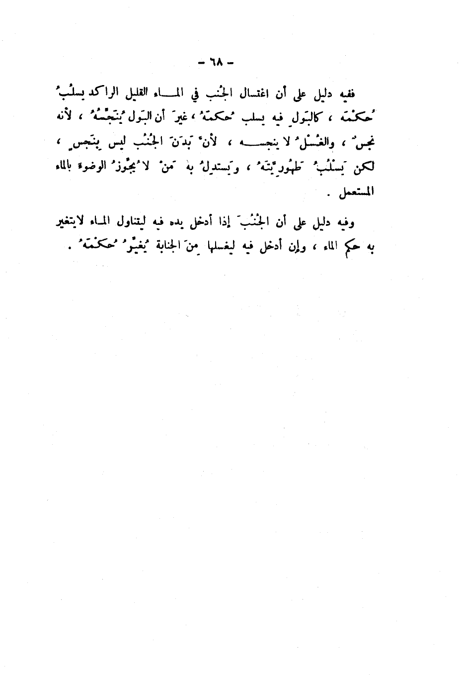 فَفِيهِ دَلِيلٌ عَلَى أَنَّ اغْتِسَالَ الْجُنُبِ فِي الْمَاءِ الْقَلِيلِ الرَّاكِدِ يَسْلُبُ حُكْمَهُ، كَالْبَوْلِ فِيهِ يَسْلُبُ حُكْمَهُ، غَيْرَ أَنَّ الْبَوْلَ يُنَجِّسُهُ، لأَنَّهُ نَجِسٌ، وَالْغُسْلُ لَا يُنَجِّسُهُ، لأَنَّ بَدَنَ الْجُنُبِ لَيْسَ بِنَجِسٍ، لَكِنْ يَسْلُبُ طَهُورِيَّتَهُ، وَيَسْتَدِلُّ بِهِ مَنْ لَا يُجَوِّزُ الْوُضُوءَ بِالْمَاءِ الْمُسْتَعْمَلِ.