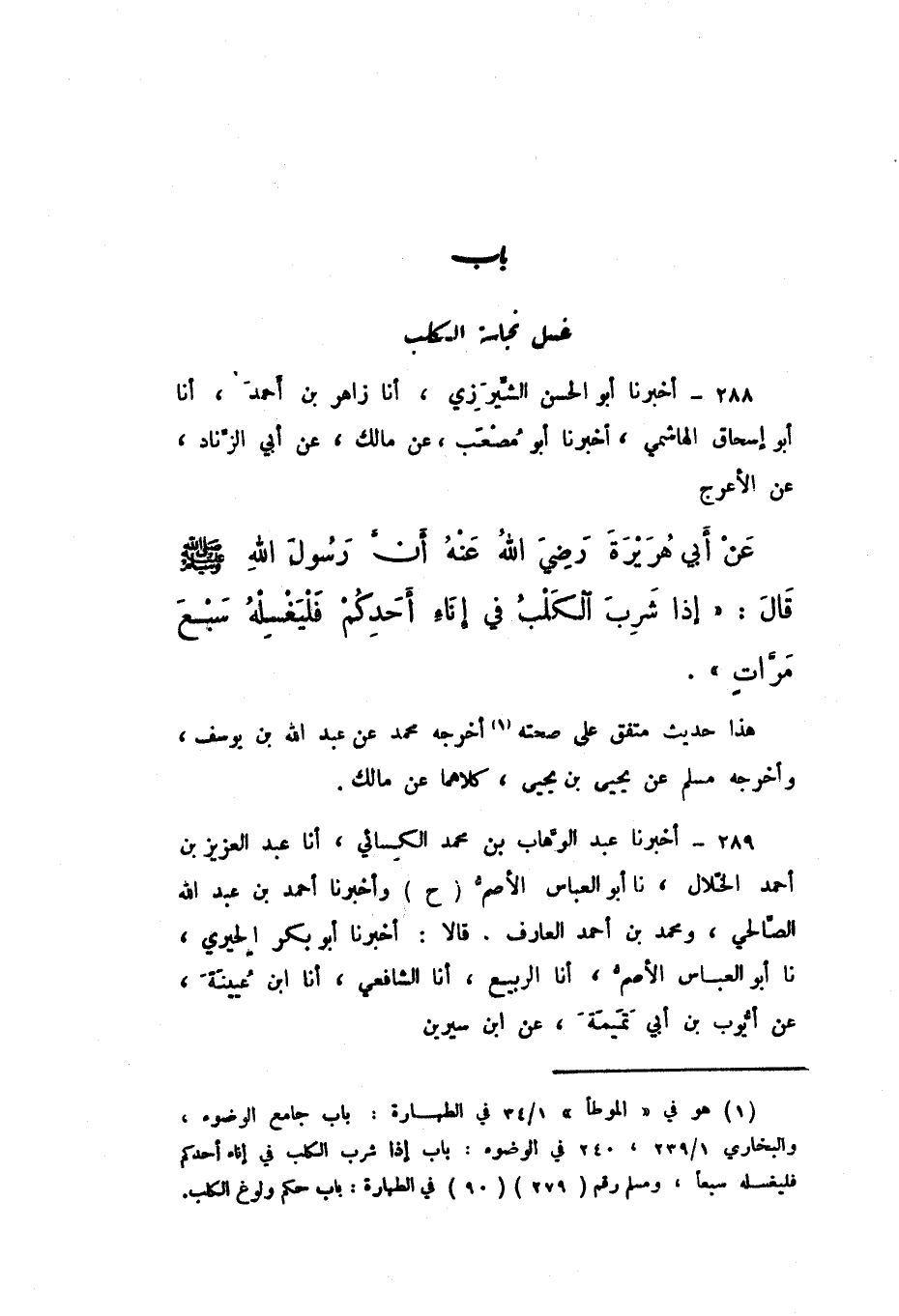 288 - أَخْبَرَنَا أَبُو الْحَسَنِ الشِّيرَزِيُّ، أَنا زَاهِرُ بْنُ أَحْمَدَ، أَنا أَبُو إِسْحَاقَ الْهَاشِمِيُّ، أَخْبَرَنَا أَبُو مُصْعَبٍ، عَنْ مَالِكٍ، عَنْ أَبِي الزِّنَادِ، عَنِ الأَعْرَجِ، عَنْ أَبِي هُرَيْرَةَ رَضِيَ اللَّهُ عَنْهُ، أَنَّ رَسُولَ اللَّهِ صَلَّى اللهُ عَلَيْهِ وَسَلَّمَ، قَالَ: «إِذَا شَرِبَ الْكَلْبُ فِي إِنَاءِ أَحَدِكُمْ فَلْيَغْسِلْهُ سَبْعَ مَرَّاتٍ».