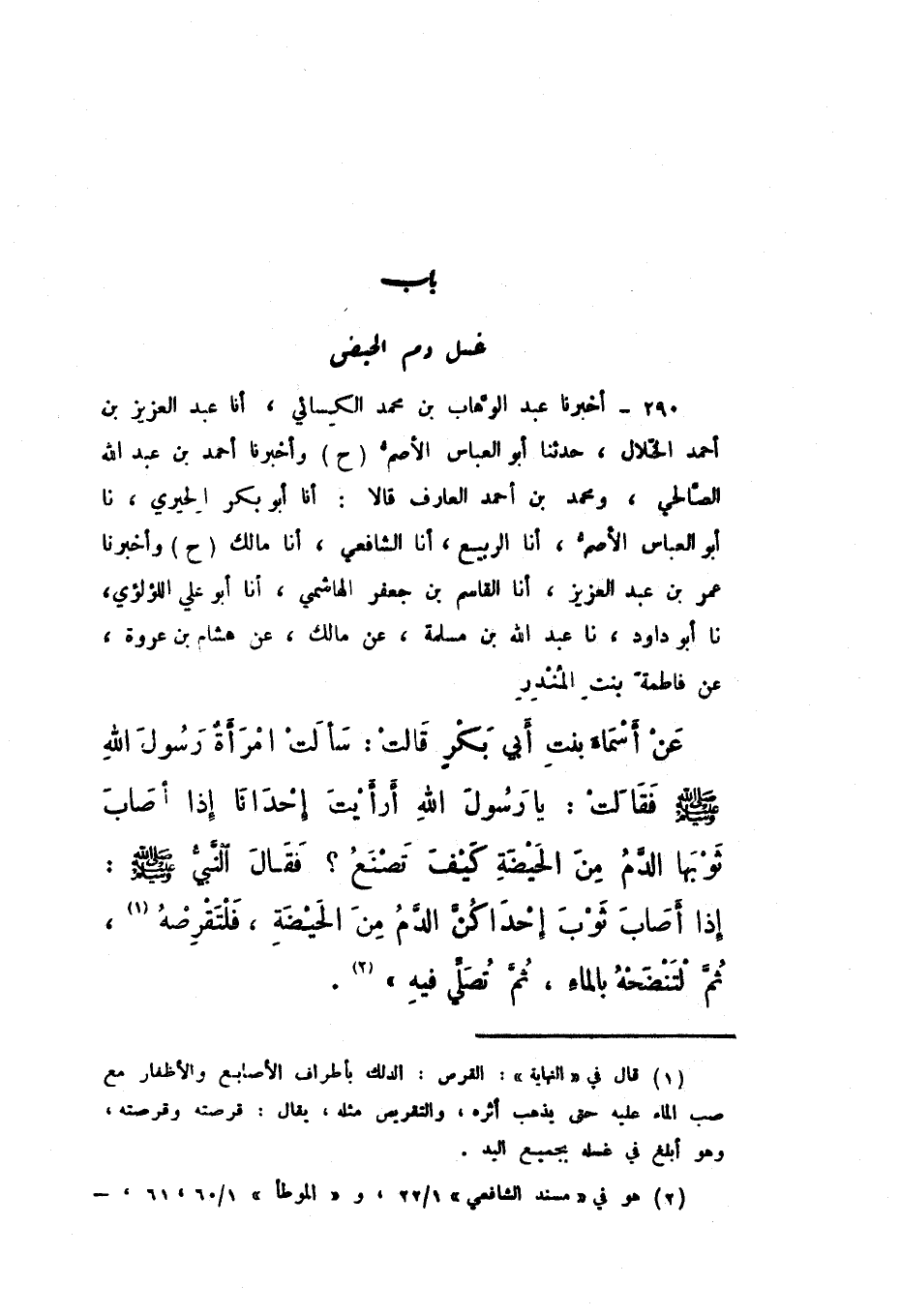 ح وَأَخْبَرَنَا عُمَرُ بْنُ عَبْدِ الْعَزِيزِ، أَنا الْقَاسِمُ بْنُ جَعْفَرٍ الْهَاشِمِيُّ، أَنا أَبُو عَلِيٍّ اللُّؤْلُئِيُّ، نَا أَبُو دَاوُدَ، نَا عَبْدُ اللَّهِ بْنُ مَسْلَمَةَ، عَنْ مَالِكٍ، عَنْ هِشَامِ بْنُ عُرْوَةَ، عَنْ فَاطِمَةَ بِنْتِ الْمُنْذِرِ، عَنْ أَسْمَاءَ بِنْتِ أَبِي بَكْرٍ، قَالَتْ: " سَأَلَتِ امْرَأَةٌ رَسُولَ اللَّهِ صَلَّى اللهُ عَلَيْهِ وَسَلَّمَ، فَقَالَتْ: يَا رَسُولَ اللَّهِ، أَرَأَيْتَ إِحْدَانَا إِذَا أَصَابَ ثَوْبَهَا الدَّمُ مِنَ الْحَيْضَةِ، كَيْفَ تَصْنَعُ؟ فَقَالَ النَّبِيُّ صَلَّى اللهُ عَلَيْهِ وَسَلَّمَ: «إِذَا أَصَابَ ثَوْبَ إِحْدَاكُنَّ الدَّمُ مِنَ الْحَيْضَةِ، فَلْتَقْرِصْهُ، ثُمَّ لِتَنْضَحْهُ بِالْمَاءِ، ثُمَّ تُصَلِّي فِيهِ».