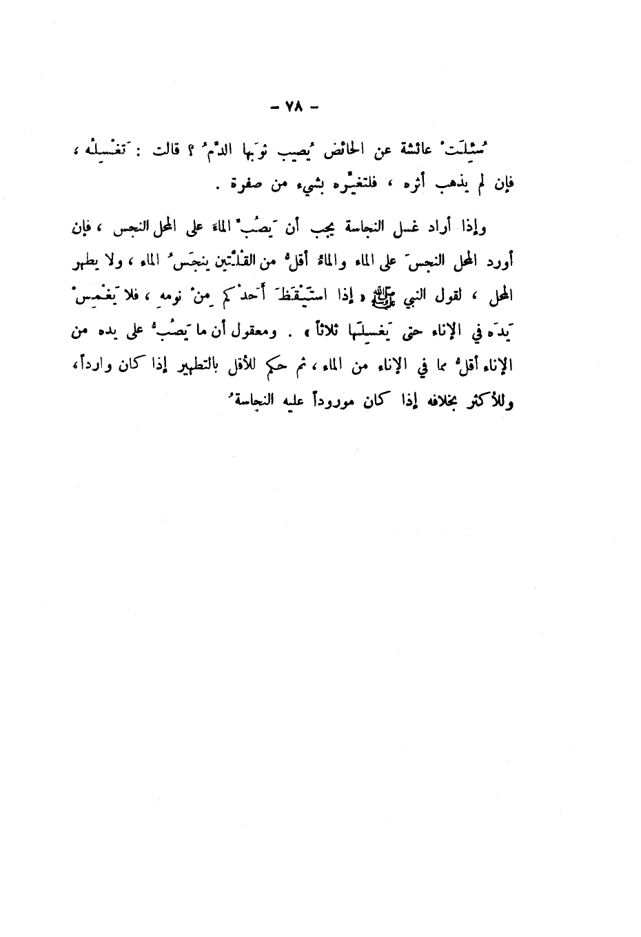 وَإِذَا أَرَادَ غَسْلَ النَّجَاسَةِ يَجِبُ أَنْ يَصُبَّ الْمَاءَ عَلَى الْمَحَلِّ النَّجِسِ، فَإِنْ أَوْرَدَ الْمَحَلَّ النَّجِسَ عَلَى الْمَاءِ، وَالْمَاءُ أَقَلُّ مِنَ الْقُلَّتَيْنِ يَنْجسُ الْمَاءُ، وَلا يَطْهُرُ الْمَحَلُّ، لِقَوْلِ النَّبِيِّ صَلَّى اللَّهُ عَلَيْهِ وَسَلَمَّ: «إِذَا اسْتَيْقَظَ أَحَدُكُمْ مِنْ نَوْمِهِ، فَلا يَغْمِسْ يَدَهُ فِي الإِنَاءِ حَتَّى يَغْسِلَهَا ثَلاثًا».
