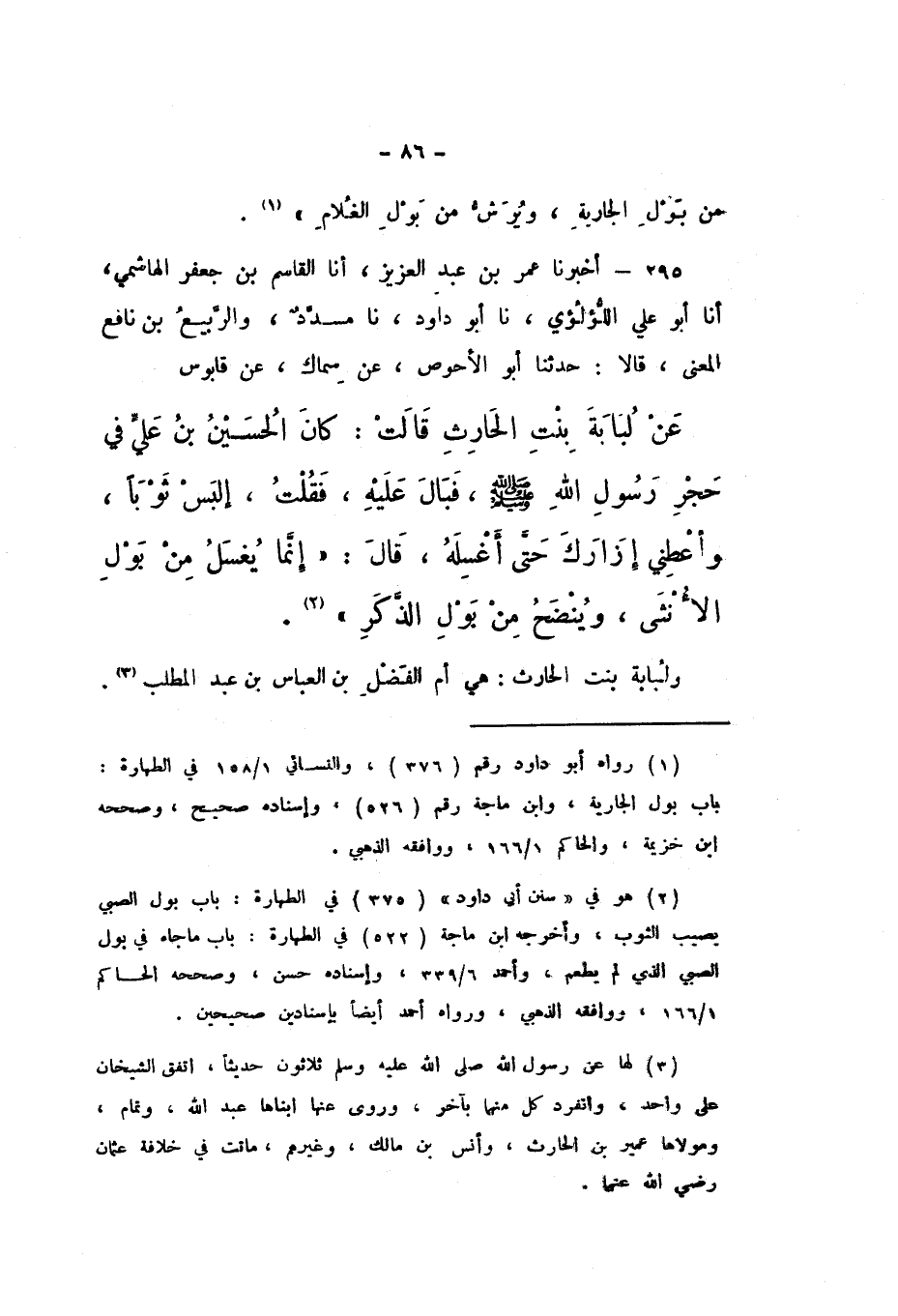 295 - أَخْبَرَنَا عُمَرُ بْنُ عَبْدِ الْعَزِيزِ، أَنا الْقَاسِمُ بْنُ جَعْفَرٍ الْهَاشِمِيُّ، أَنا أَبُو عَلِيٍّ اللُّؤْلُئِيُّ، نَا أَبُو دَاوُدَ، نَا مُسَدَّدٌ، وَالرَّبِيعُ بْنُ نَافِعٍ، الْمَعْنَى، قَالا: حَدَّثَنَا أَبُو الأَحْوَصِ، عَنْ سِمَاكٍ، عَنْ قَابُوسَ، عَنْ لُبَابَةَ بِنْتَ الْحَارِثِ، قَالَتْ: كَانَ الْحُسَيْنُ بْنُ عَلِيٍّ فِي حِجْرِ رَسُولِ اللَّهِ صَلَّى اللهُ عَلَيْهِ وَسَلَّمَ، فَبَالَ عَلَيْهِ، فَقُلْتُ: الْبَسْ ثَوْبًا، وَأَعْطِنِي إِزَارَكَ حَتَّى أَغْسِلَهُ، قَالَ: «إِنَّمَا يُغْسَلُ مِنْ بَوْلِ الأُنْثَى، وَيُنْضَحُ مِنْ بَوْلِ الذَّكَرِ»