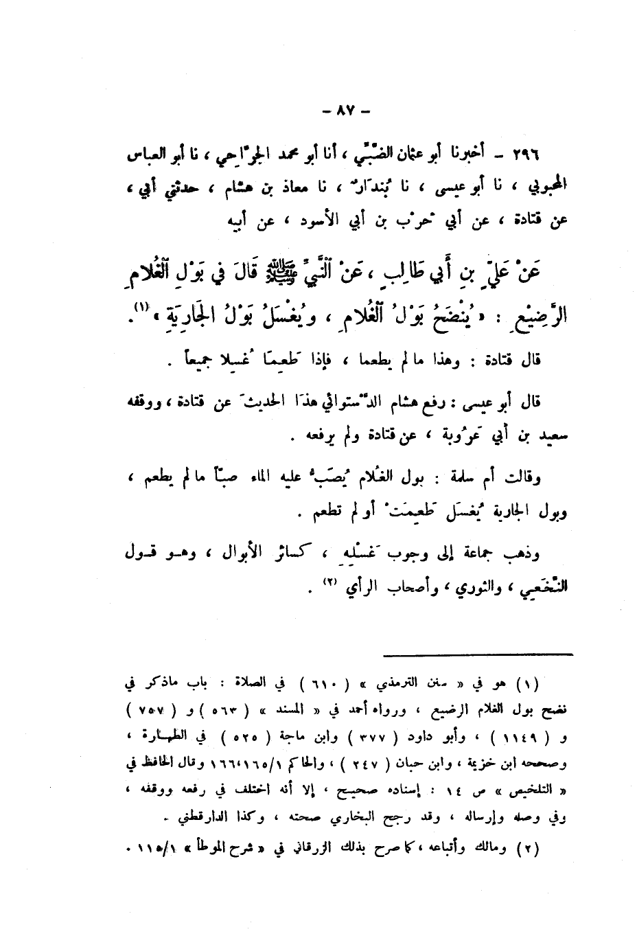 296 - أَخْبَرَنَا أَبُو عُثْمَانَ الضَّبِّيُّ، أَنا أَبُو مُحَمَّدٍ الْجَرَّاحِيُّ، نَا أَبُو الْعَبَّاسِ الْمَحْبُوبِيُّ، نَا أَبُو عِيسَى، نَا بُنْدَارٌ، نَا مُعَاذُ بْنُ هِشَامٍ، حَدَّثَنِي أَبِي، عَنْ قَتَادَةَ، عَنْ أَبِي حَرْبِ بْنِ أَبِي الأَسْوَدِ، عَنْ أَبِيهِ، عَنْ عَلِيِّ بْنِ أَبِي طَالِبٍ، عَنِ النَّبِيِّ صَلَّى اللهُ عَلَيْهِ وَسَلَّمَ، قَالَ فِي بَوْلِ الْغُلامِ الرَّضِيعِ: «يُنْضَحُ بَوْلُ الْغُلامِ، وَيُغْسَلُ بَوْلُ الْجَارِيَةِ»