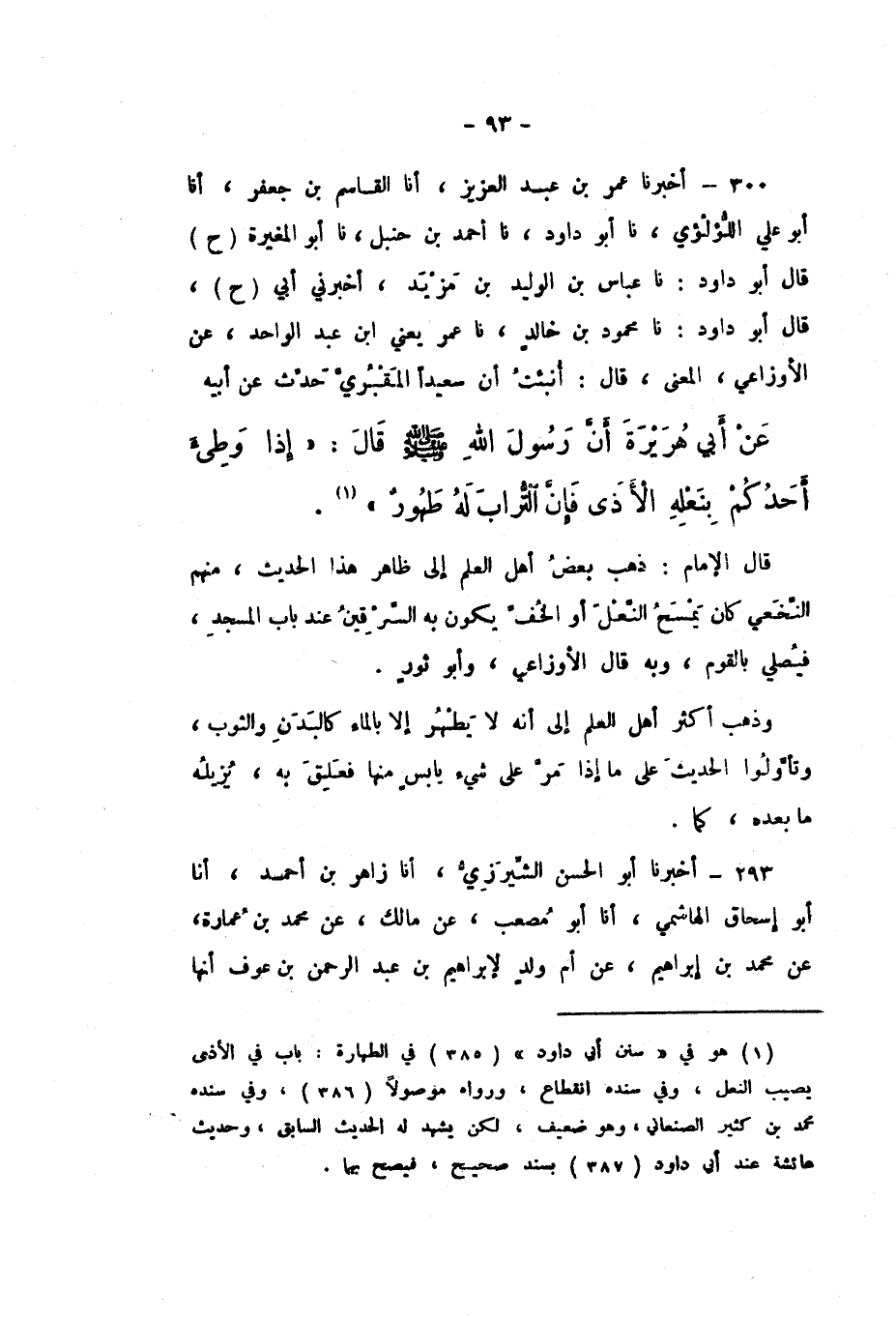 قَالَ الإِمَامُ: ذَهَبَ بَعْضُ أَهْلِ الْعِلْمِ إِلَى ظَاهِرِ هَذَا الْحَدِيثِ، مِنْهُمُ النَّخَعِيّ، كَانَ يَمْسَحُ النَّعْلَ أَوِ الْخُفَّ يَكُونُ بِهِ السِّرْقِينُ عِنْدَ بَابِ الْمَسْجِدِ، فَيُصَلِّي بِالْقَوْمِ، وَبِهِ قَالَ الأَوْزَاعِيُّ، وَأَبُو ثَوْرٍ.
