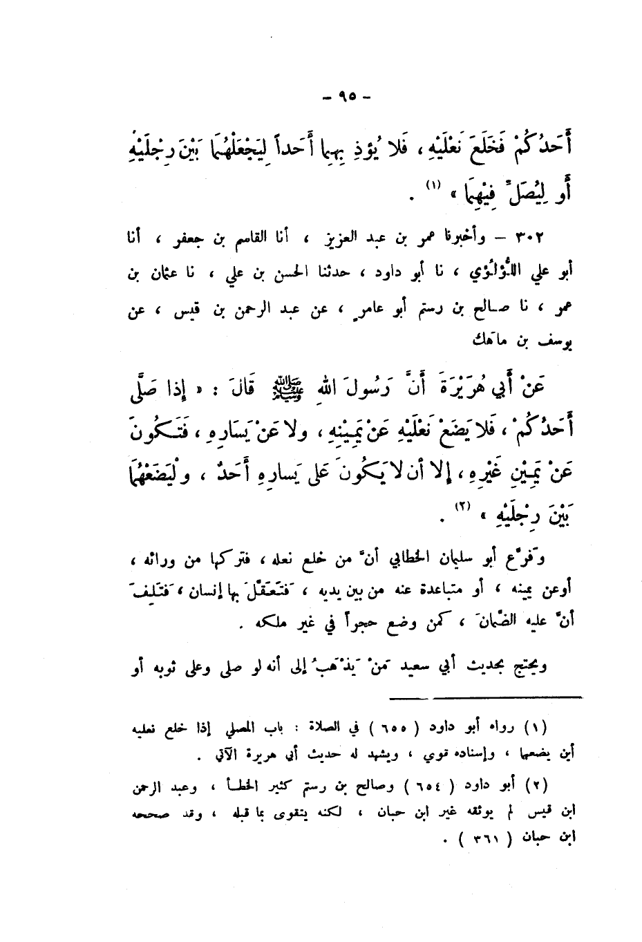 302 - وَأَخْبَرَنَا عُمَرُ بْنُ عَبْدِ الْعَزِيزِ، أَنا الْقَاسِمُ بْنُ جَعْفَرٍ، أَنا أَبُو عَلِيٍّ اللُّؤْلُئِيُّ، نَا أَبُو دَاوُدَ، حَدَّثَنَا الْحَسَنُ بْنُ عَلِيٍّ، نَا عُثْمَانُ بْنُ عُمَرَ، نَا صَالِحُ بْنُ رُسْتُمَ أَبُو عَامِرٍ، عَنْ عَبْدِ الرَّحْمَنِ بْنِ قَيْسٍ، عَنْ يُوسُفَ بْنِ مَاهَكَ، عَنْ أَبِي هُرَيْرَةَ، أَنَّ رَسُولَ اللَّهِ صَلَّى اللهُ عَلَيْهِ وَسَلَّمَ، قَالَ: «إِذَا صَلَّى أَحَدُكُمْ، فَلا يَضَعْ نَعْلَيْهِ عَنْ يَمِينِهِ، وَلا عَنْ يَسَارِهِ، فَتَكُونَ عَنْ يَمِينِ غَيْرِهِ، إِلا أَنْ لَا يَكُونَ عَلَى يَسَارِهِ أَحَدٌ، وَلْيَضَعْهُمَا بَيْنَ رِجْلَيْهِ»