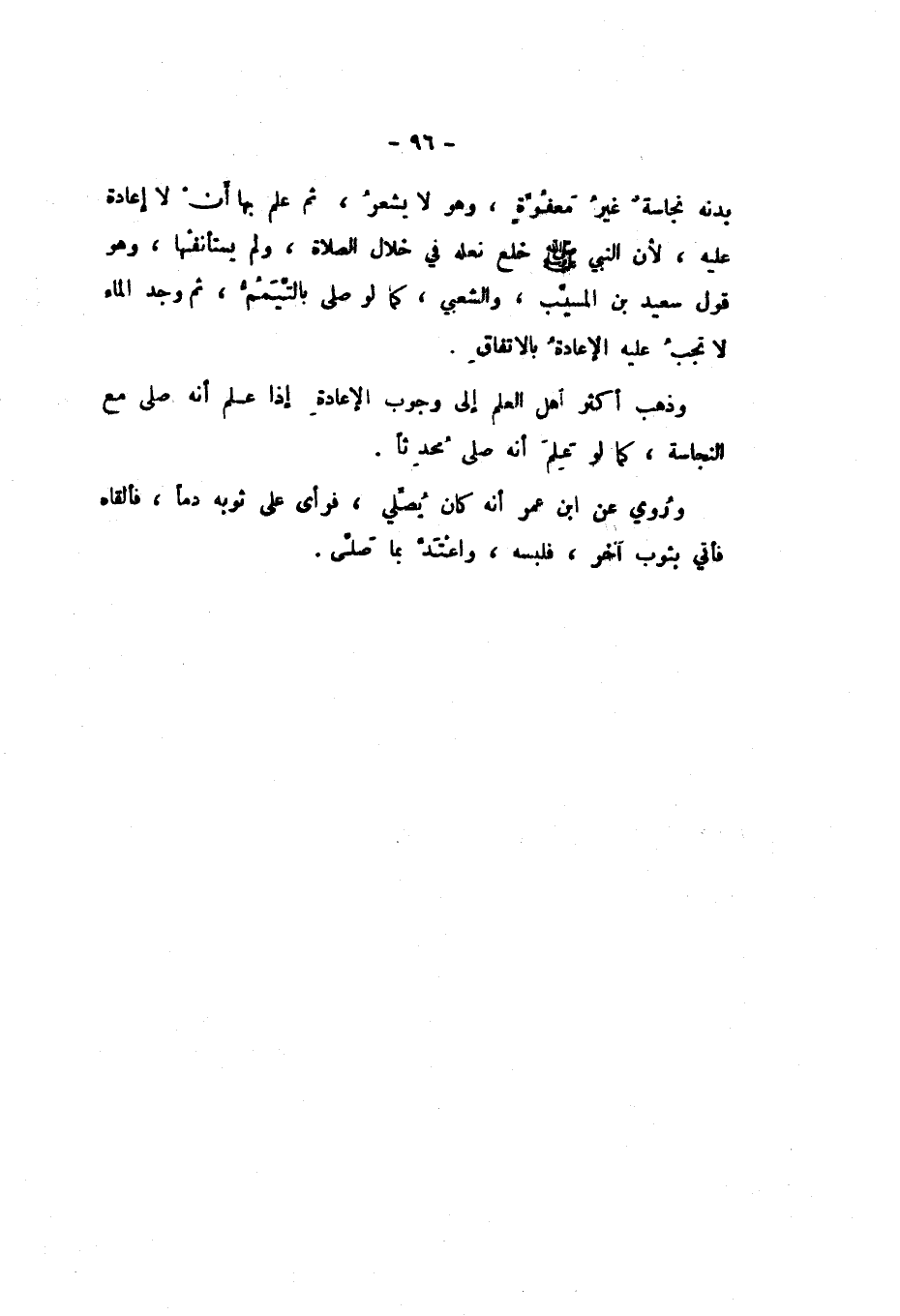 وَرُوِيَ عَنِ ابْنِ عُمَرَ، أَنَّهُ كَانَ يُصَلِّي، فَرَأَى عَلَى ثَوْبِهِ دَمًا، فَأَلْقَاهُ، فَأُتِيَ بِثَوْبٍ آخَرَ، فَلَبِسَهُ، وَاعْتَدَّ بِمَا صَلَّى.