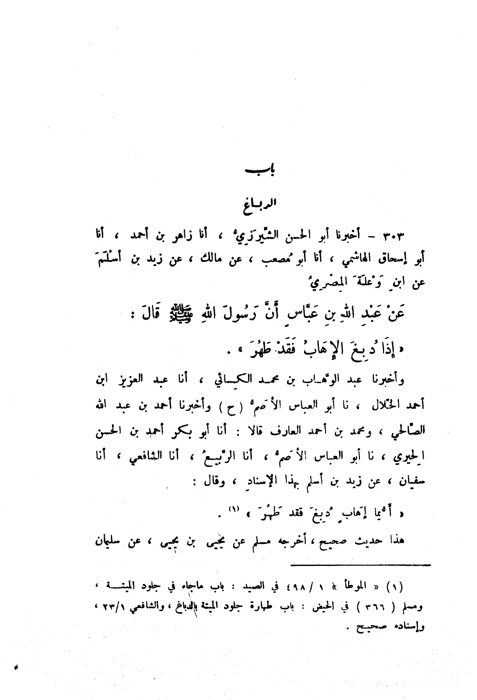 303 - أَخْبَرَنَا أَبُو الْحَسَنِ الشِّيرَزِيُّ، أَنا زَاهِرُ بْنُ أَحْمَدَ، أَنا أَبُو إِسْحَاقَ الْهَاشِمِيُّ، أَنا أَبُو مُصْعَبٍ، عَنْ مَالِكٍ، عَنْ زَيْدِ بْنِ أَسْلَمَ، عَنِ ابْنِ وَعْلَةَ الْمِصْرِيِّ، عَنْ عَبْدِ اللَّهِ بْنِ عَبَّاسٍ، أَنَّ رَسُولَ اللَّهِ صَلَّى اللهُ عَلَيْهِ وَسَلَّمَ، قَالَ: «إِذَا دُبِغَ الإِهَابُ فَقَدْ طَهُرَ».