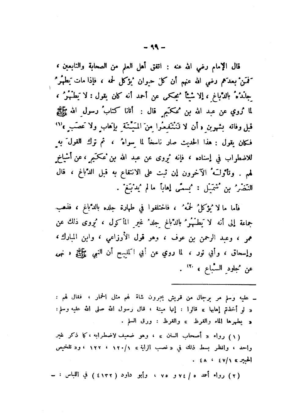قَالَ الإِمَامُ رَضِيَ اللَّهُ عَنْهُ: اتَّفَقَ أَهْلُ الْعِلْمِ مِنَ الصَّحَابَةِ وَالتَّابِعِينَ، فَمَنْ بَعْدَهُمْ رَضِيَ اللَّهُ عَنْهُمْ أَنَّ كُلَّ حَيَوَانٍ يُؤْكَلُ لَحْمُهُ، فَإِذَا مَاتَ يَطْهُرُ جِلْدُهُ بِالدِّبَاغِ، إِلا شَيْئًا يُحْكَى عَنْ أَحْمَدَ، أَنَّهُ كَانَ يَقُولُ: «لَا يَطْهُرُ»، لِمَا رُوِيَ عَنْ عَبْدِ اللَّهِ بْنِ عُكَيْمٍ، قَالَ: أَتَانَا كِتَابُ رَسُولِ اللَّهِ صَلَّى اللهُ عَلَيْهِ وَسَلَّمَ قَبْلَ وَفَاتِهِ بِشَهْرَيْنِ: «أَنْ لَا تَنْتَفِعُوا مِنَ الْمَيْتَةِ بِإِهَابٍ وَلا عَصَبٍ» فَكَانَ يَقُولُ: هَذَا الْحَدِيثُ صَارَ نَاسِخًا لِمَا سِوَاهُ، ثُمَّ تَرَكَ الْقَوْلَ بِهِ لِلاضْطِرَابِ فِي إِسْنَادِهِ، فَإِنَّهُ يُرْوَى عَنْ عَبْدِ اللَّهِ بْنِ عُكَيْمٍ، عَنْ أَشْيَاخٍ لَهُمْ، وَتَأَوَّلَهُ الآخَرُونَ إِنْ ثَبَتَ عَلَى الانْتِفَاعِ بِهِ قَبْلَ الدِّبَاغِ.