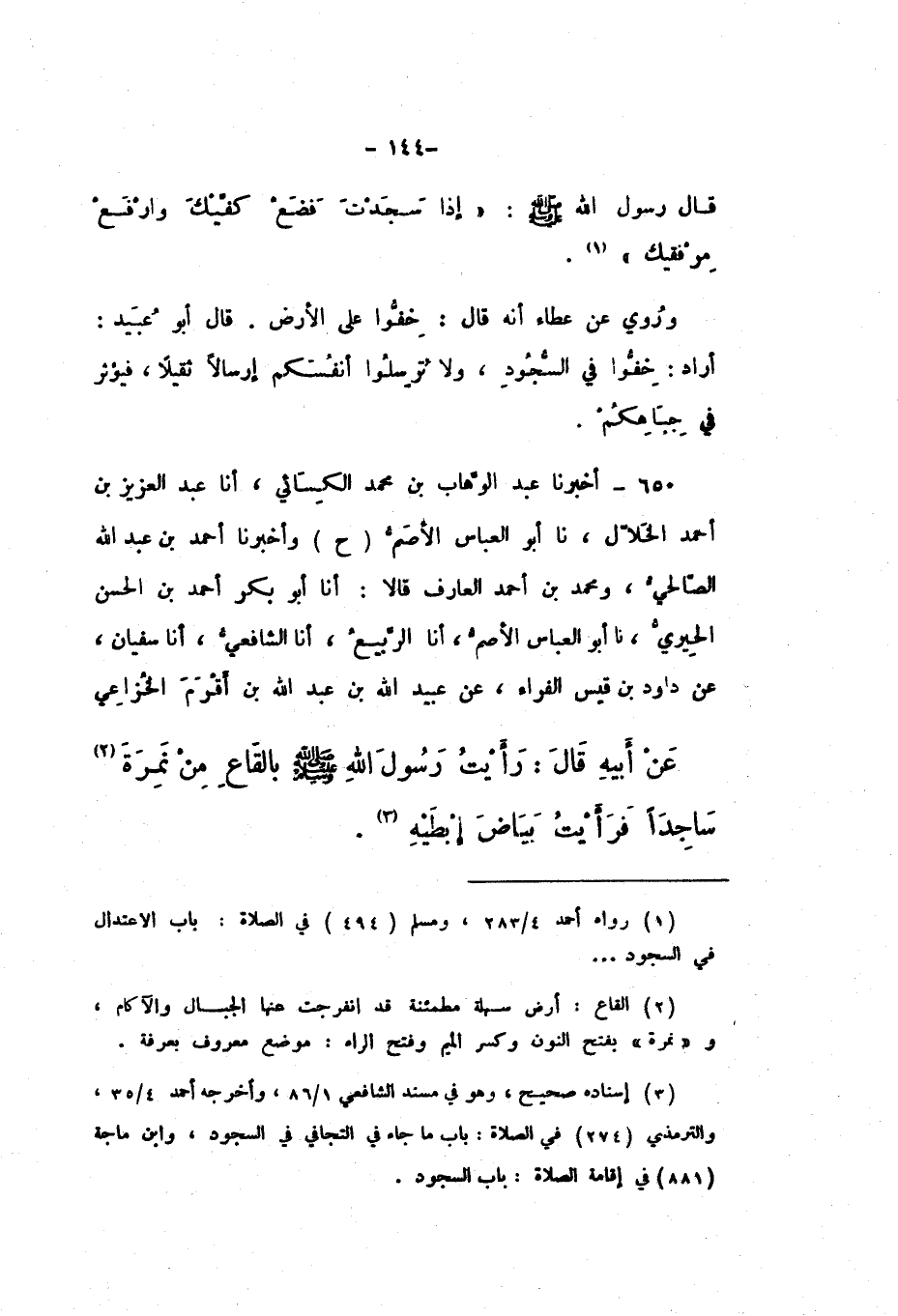 ح وَأَخْبَرَنَا أَحْمَدُ بْنُ عَبْدِ اللَّهِ الصَّالِحِيُّ، وَمُحَمَّدُ بْنُ أَحْمَدَ الْعَارِفُ، قَالا: أَنَا أَبُو بَكْرٍ أَحْمَدُ بْنُ الْحَسَنِ الْحِيرِيُّ، نَا أَبُو الْعَبَّاسِ الأَصَمُّ، أَنَا الرَّبِيعُ، أَنَا الشَّافِعِيُّ، أَنَا سُفْيَانُ، عَنْ دَاوُدَ بْنِ قَيْسٍ الْفَرَّاءِ، عَنْ عُبَيْدِ اللَّهِ بْنِ عَبْدِ اللَّهِ بْنِ أَقْرَمَ الْخُزَاعِيِّ، عَنْ أَبِيهِ، قَالَ: «رَأَيْتُ رَسُولَ اللَّهِ صَلَّى اللهُ عَلَيْهِ وَسَلَّمَ بِالْقَاعِ مِنْ نَمِرَةَ سَاجِدًا فَرَأَيْتُ بَيَاضَ إِبْطَيْهِ».