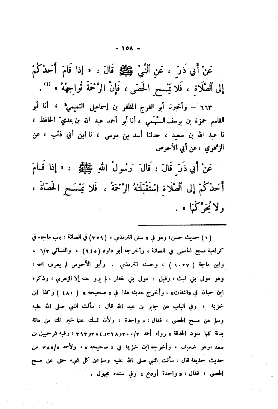 663 - وَأَخْبَرَنَا أَبُو الْفَرَجِ الْمُظَفَّرُ بْنُ إِسْمَاعِيلَ التَّمِيمِيُّ، أَنَا أَبُو الْقَاسِمِ حَمْزَةُ بْنُ يُوسُفَ السَّهْمِيُّ، أَنَا أَبُو أَحْمَدَ عَبْدُ اللَّهِ بْنُ عَدِيٍّ الْحَافِظُ، نَا عَبْدُ اللَّهِ بْنُ سَعِيدٍ، حَدَّثَنَا أَسَدُ بْنُ مُوسَى، نَا ابْنُ أَبِي ذِئْبٍ، عَنِ الزُّهْرِيِّ، عَنْ أَبِي الأَحْوَصِ، عَنْ أَبِي ذَرٍّ، 5 قَالَ: قَالَ رَسُولُ اللَّهِ صَلَّى اللهُ عَلَيْهِ وَسَلَّمَ: «إِذَا قَامَ أَحَدُكُمْ إِلَى الصَّلاةِ اسْتَقْبَلَتْهُ الرَّحْمَةُ، فَلا يَمْسَحِ الْحَصَاةَ، وَلا يُحَرِّكْهَا».