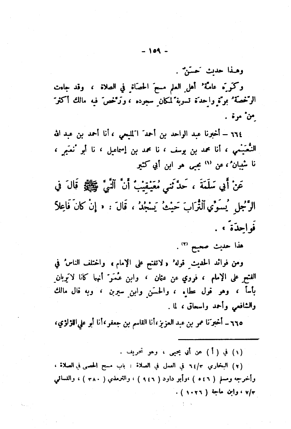 664 - أَخْبَرَنَا عَبْدُ الْوَاحِدِ بْنُ أَحْمَدَ الْمَلِيحِيُّ، أَنَا أَحْمَدُ بْنُ عَبْدِ اللَّهِ النُّعَيْمِيُّ، أَنَا مُحَمَّدُ بْنُ يُوسُفَ، نَا مُحَمَّدُ بْنُ إِسْمَاعِيلَ، نَا أَبُو نُعَيْمٍ، نَا شَيْبَانُ، عَنْ يَحْيَى هُوَ ابْنُ أَبِي كَثِيرٍ، عَنْ أَبِي سَلَمَةَ، حَدَّثَنِي مُعَيْقِيبٌ، " أَنَّ النَّبِيَّ صَلَّى اللهُ عَلَيْهِ وَسَلَّمَ قَالَ فِي الرَّجُلِ يُسَوِّي التُّرَابَ حَيْثُ يَسْجُدُ، قَالَ: إِنْ كَانَ فَاعِلا فَوَاحِدَةً ".