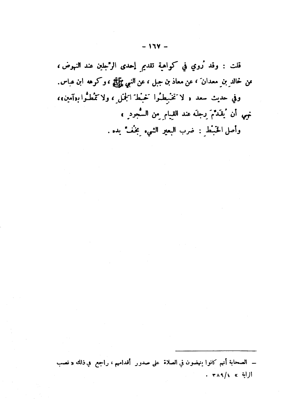 قُلْتُ: وَقَدْ رُوِيَ فِي كَرَاهِيَةِ تَقْدِيمِ إِحْدَى الرِّجْلَيْنِ عِنْدَ النُّهُوضِ، عَنْ خَالِدِ بْنِ مَعْدَانَ، عَنْ مُعَاذِ بْنِ جَبَلٍ، عَنِ النَّبِيِّ صَلَّى اللهُ عَلَيْهِ وَسَلَّمَ، وَكَرِهَهُ ابْنُ عَبَّاسٍ.