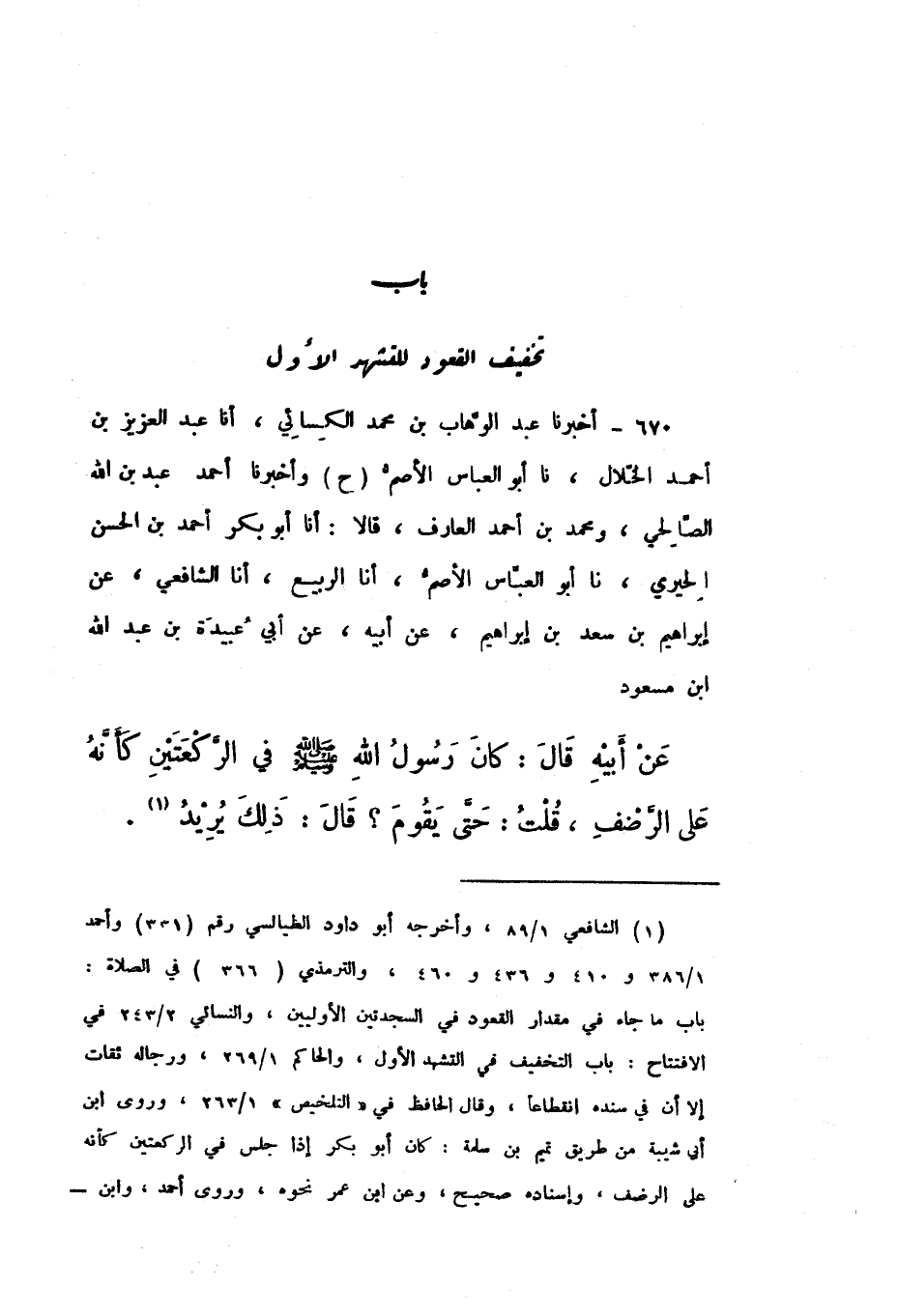ح وَأَخْبَرَنَا أَحْمَدُ بْنُ عَبْدِ اللَّهِ الصَّالِحِيُّ، وَمُحَمَّدُ بْنُ أَحْمَدَ الْعَارِفُ، قَالا: أَنَا أَبُو بَكْرٍ أَحْمَدُ بْنُ الْحَسَنِ الْحِيرِيُّ، نَا أَبُو الْعَبَّاسِ الأَصَمُّ، أَنَا الرَّبِيعُ، أَنَا الشَّافِعِيُّ، عَنْ إِبْرَاهِيمَ بْنِ سَعْدِ بْنِ إِبْرَاهِيمَ، عَنْ أَبِيهِ، عَنْ أَبِي عُبَيْدَةَ بْنِ عَبْدِ اللَّهِ بْنِ مَسْعُودٍ، عَنْ أَبِيهِ، قَالَ: " كَانَ رَسُولُ اللَّهِ صَلَّى اللهُ عَلَيْهِ وَسَلَّمَ فِي الرَّكْعَتَيْنِ كَأَنَّهُ عَلَى الرَّضْفِ، قُلْتُ: حَتَّى يَقُومَ؟ قَالَ: ذَلِكَ يُرِيدُ ".