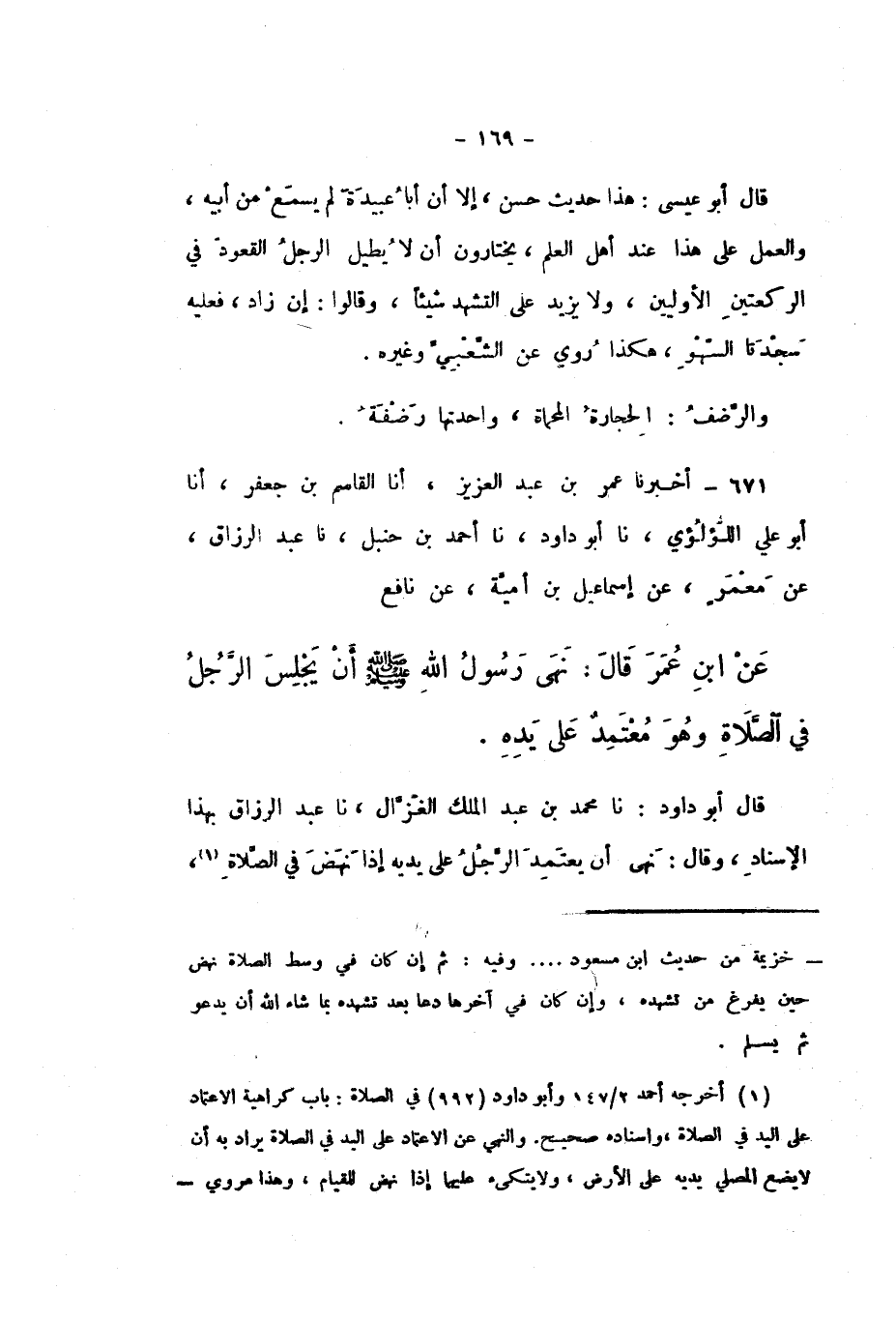 قَالَ أَبُو دَاوُدَ: نَا مُحَمَّدُ بْنُ عَبْدِ الْمَلِكِ الْغَزَّالُ، نَا عَبْدُ الرَّزَّاقِ، بِهَذَا الإِسْنَادِ، وَقَالَ: «نَهَى أَنْ يَعْتَمِدَ الرَّجُلُ عَلَى يَدَيْهِ إِذَا نَهَضَ فِي الصَّلاةِ».