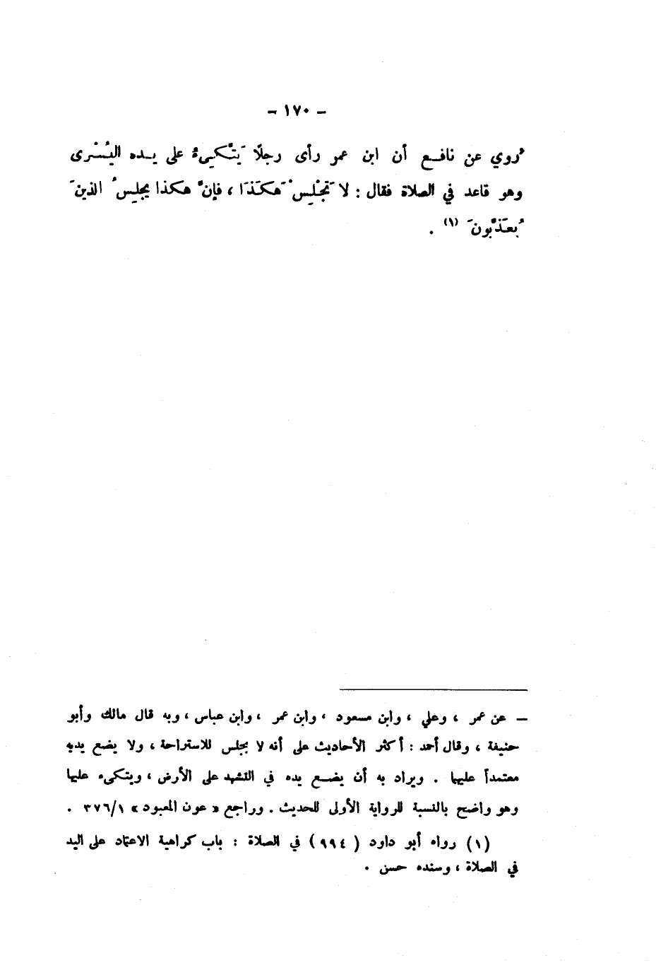 رُوِيَ عَنْ نَافِعٍ، " أَنَّ ابْنَ عُمَرَ رَأَى رَجُلا يَتَّكِئُ عَلَى يَدِهِ الْيُسْرَى وَهُوَ قَاعِدٌ فِي الصَّلاةِ، فَقَالَ: لَا تَجْلِسُ هَكَذَا، فَإِنَّ هَكَذَا يَجْلِسُ الَّذِينَ يُعَذَّبُونَ "