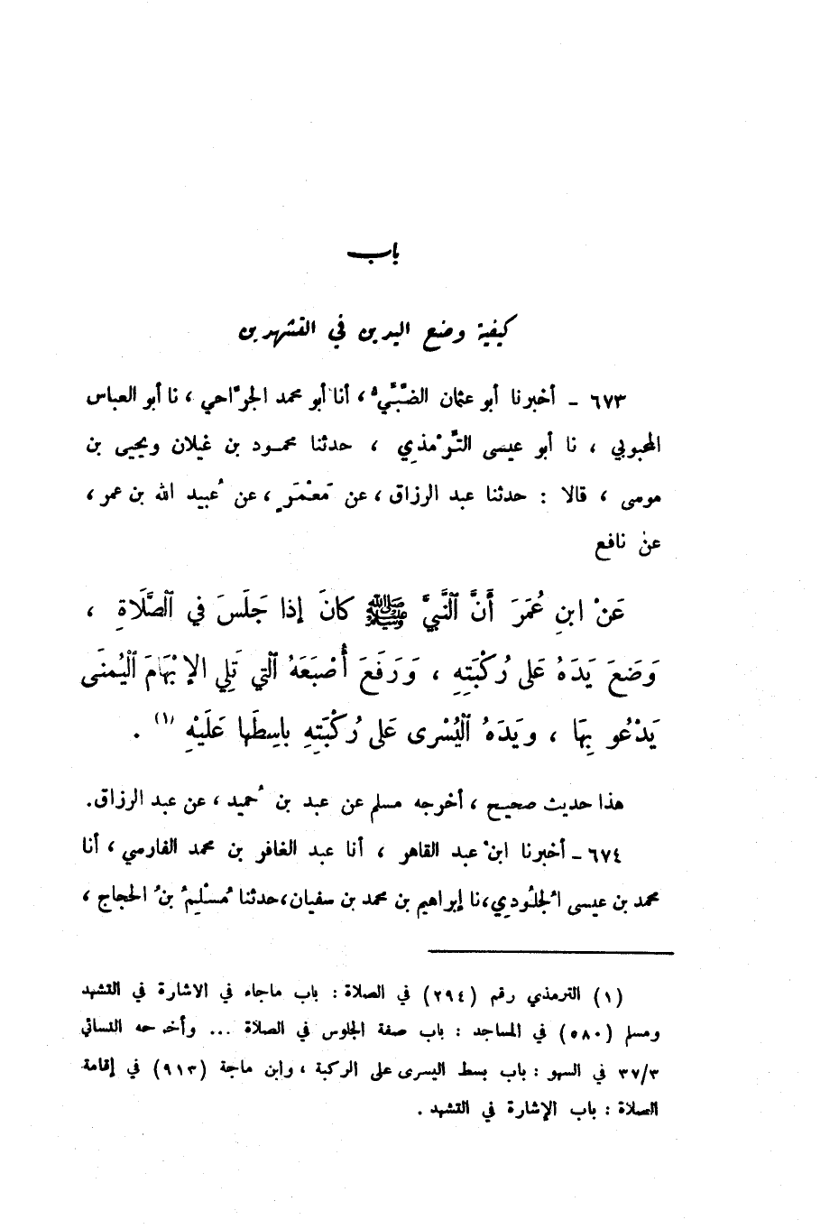 673 - أَخْبَرَنَا أَبُو عُثْمَانَ الضَّبِّيُّ، أَنَا أَبُو مُحَمَّدٍ الْجَرَّاحِيُّ، نَا أَبُو الْعَبَّاسِ الْمَحْبُوبِيُّ، نَا أَبُو عِيسَى التِّرْمِذِيُّ، حَدَّثَنَا مَحْمُودُ بْنُ غَيْلانَ، وَيَحْيَى بْنُ مُوسَى، قَالا: حَدَّثَنَا عَبْدُ الرَّزَّاقِ، عَنْ مَعْمَرٍ، عَنْ عُبَيْدِ اللَّهِ بْنِ عُمَرَ، عَنْ نَافِعٍ، عَنِ ابْنِ عُمَرَ، «أَنَّ النَّبِيَّ صَلَّى اللهُ عَلَيْهِ وَسَلَّمَ كَانَ إِذَا جَلَسَ فِي الصَّلاةِ، وَضَعَ يَدَهُ عَلَى رُكْبَتَيْهِ، وَرَفَعَ أُصْبُعَهُ الَّتِي تَلِي الإِبْهَامَ الْيُمْنَى يَدْعُو بِهَا، وَيَدَهُ الْيُسْرَى عَلَى رُكْبَتِهِ بَاسِطَهَا عَلَيْهِ».