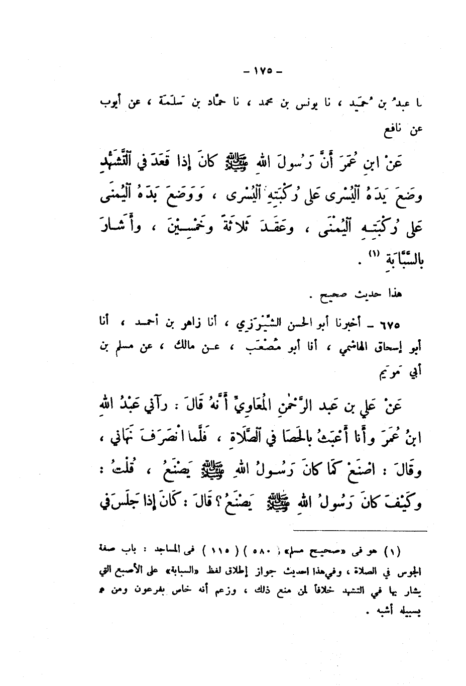 نَا عَبْدُ بْنُ حُمَيْدٍ، نَا يُونُسُ بْنُ مُحَمَّدٍ، نَا حَمَّادُ بْنُ سَلَمَةَ، عَنْ أَيُّوبَ، عَنْ نَافِعٍ، عَنِ ابْنِ عُمَرَ، «أَنَّ رَسُولَ اللَّهِ صَلَّى اللهُ عَلَيْهِ وَسَلَّمَ كَانَ إِذَا قَعَدَ فِي التَّشَهُّدِ وَضَعَ يَدَهُ الْيُسْرَى عَلَى رُكْبَتِهِ الْيُسْرَى، وَوَضَعَ يَدَهُ الْيُمْنَى عَلَى رُكْبَتِهِ الْيُمْنَى، وَعَقَدَ ثَلاثَةً وَخَمْسِينَ، وَأَشَارَ بِالسَّبَّابَةِ».